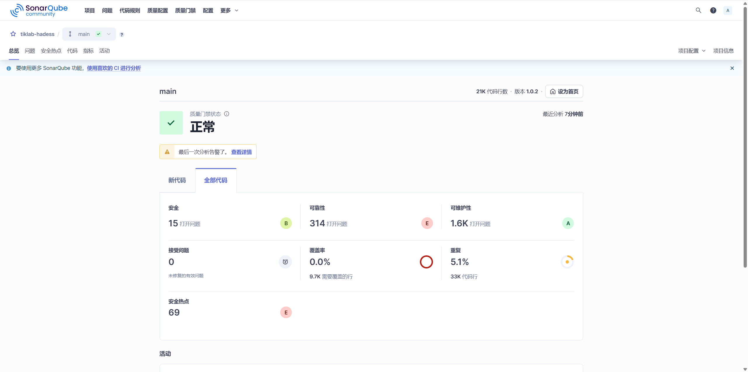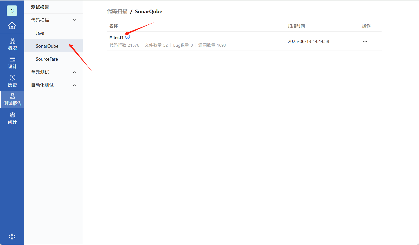 点击扫描报告名称,进入SonarQube查看代码扫描详细报告。