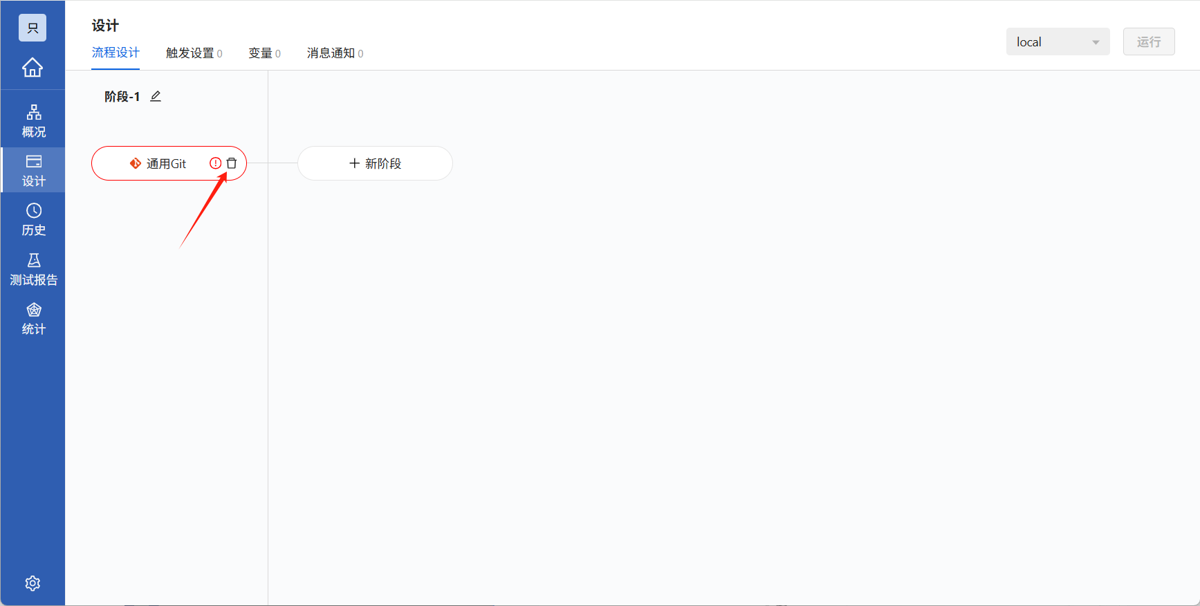 创建流水线会默认通用Git源码,一个流水线只能配置一个源码类型的的任务,修改其他类型的源码仓库,需要先删除之前的源码仓库。鼠标移动到通用Git源码,点击右侧删除按钮即可删除。