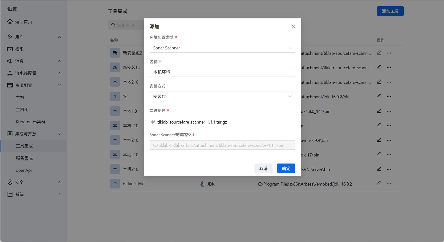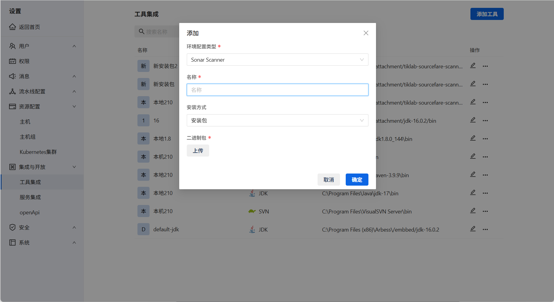 在系统设置→集成与开放→工具集成页面添加相关服务。授权类型选择Sonar Scanner、填写名称、安装方式选择安装包,上传SourceFare Scanner工具安装包。