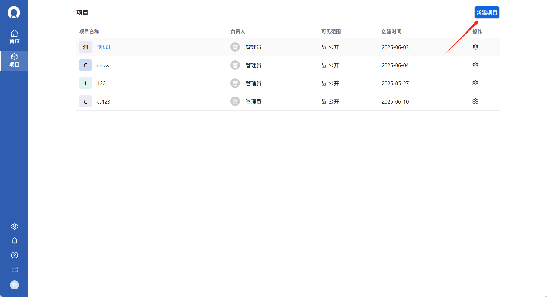 在项目页面点击新建项目按钮进行新建。输入项目名称以及项目访问信息(公开、私密)进行创建。