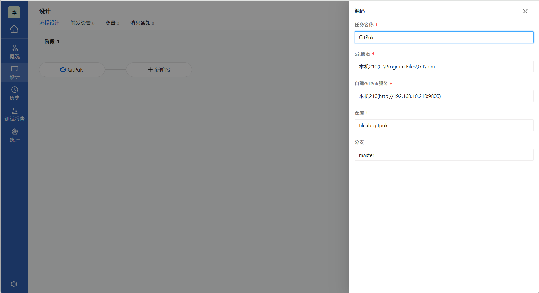 需要填入任务名称、Git版本、自检GitPuk服务、仓库、分支等信息。