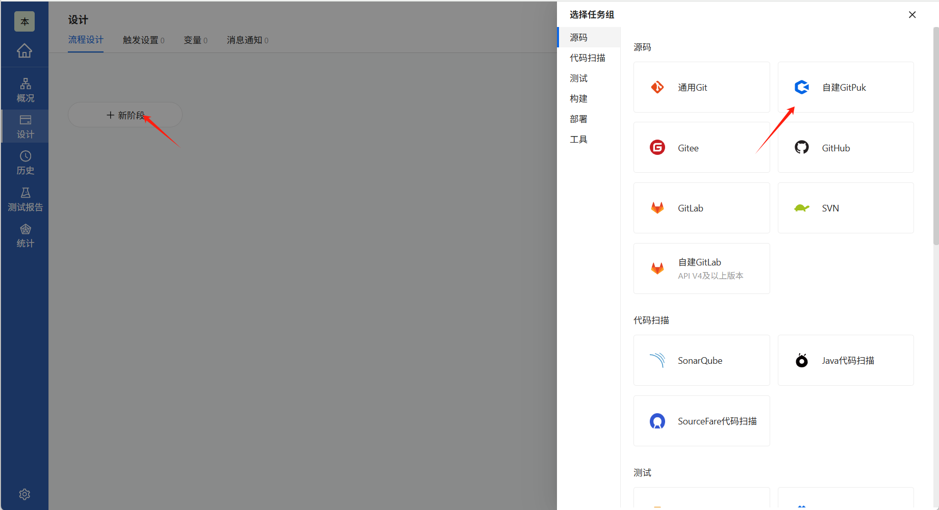 删除后,点击流水线最左侧“+”号,根据源码仓库添加源码任务,以GitPuk为例,点击新阶段→源码→自建GitPuk。