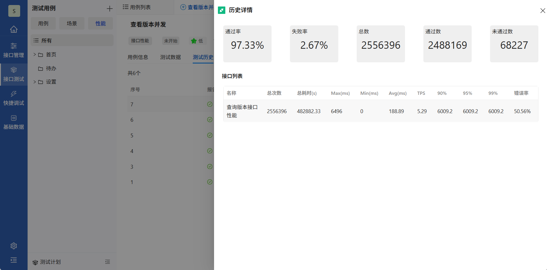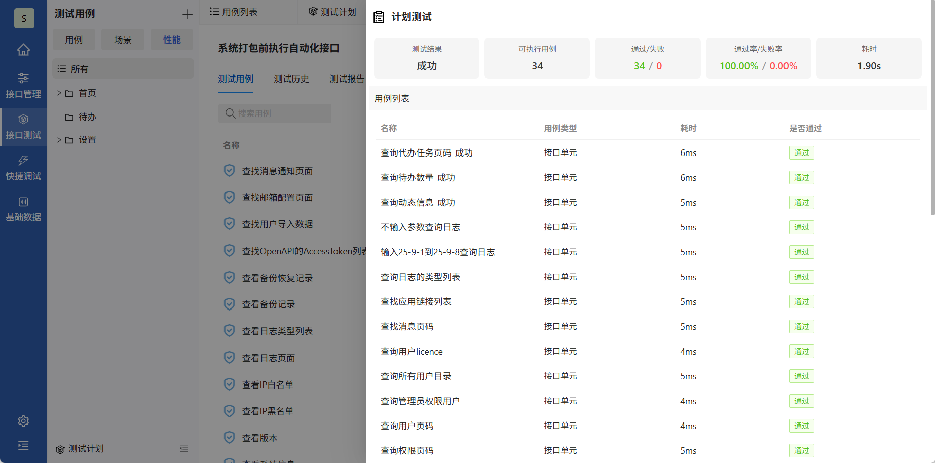 点击“测试”,弹窗显示测试结果。测试结果包含总体测试结果、执行用例数量、通过/失败数量、通过率/失败率、耗时、以及每个用例执行情况。