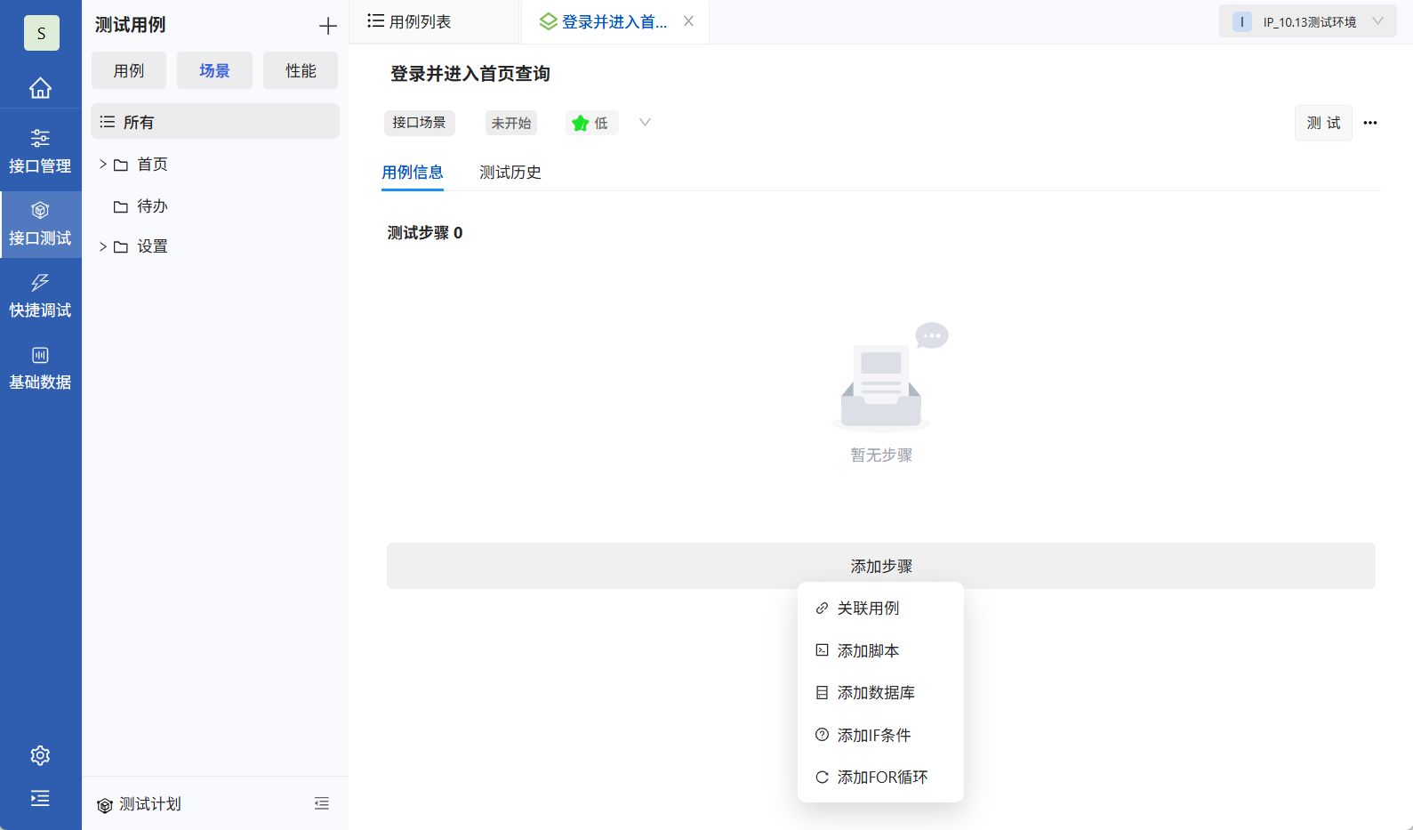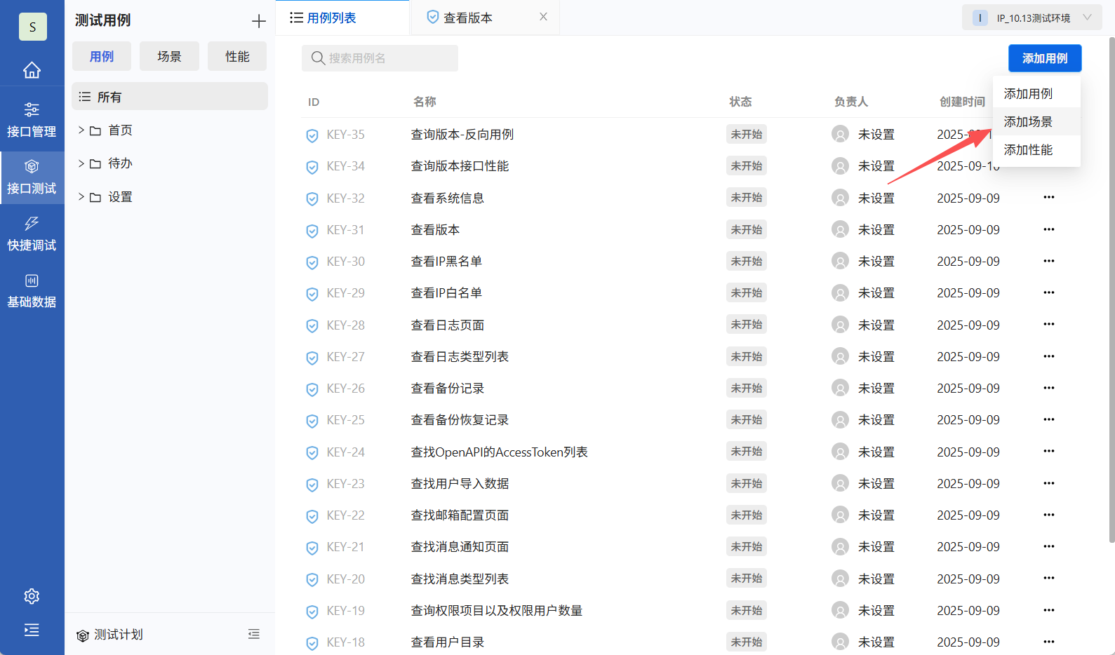 场景用例可以通过模拟真实交互场景验证系统间数据传递的准确性与可靠性,在接口测试页面点击添加场景。