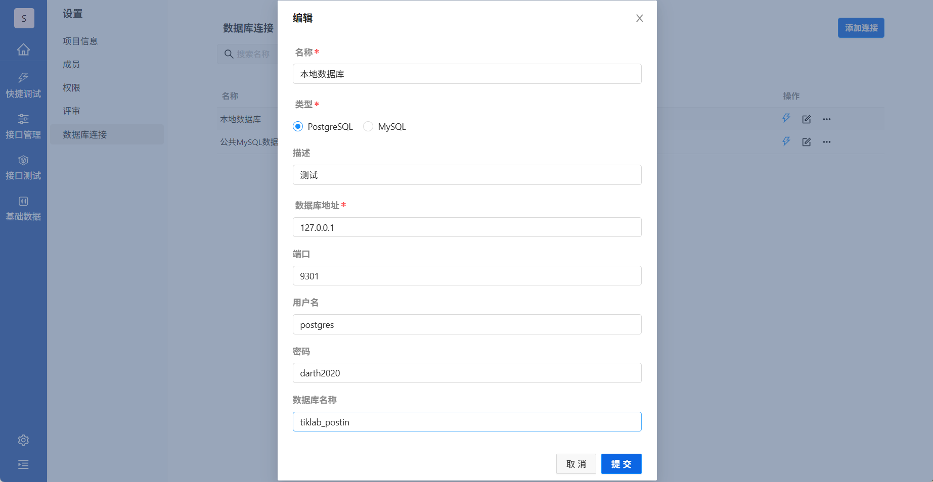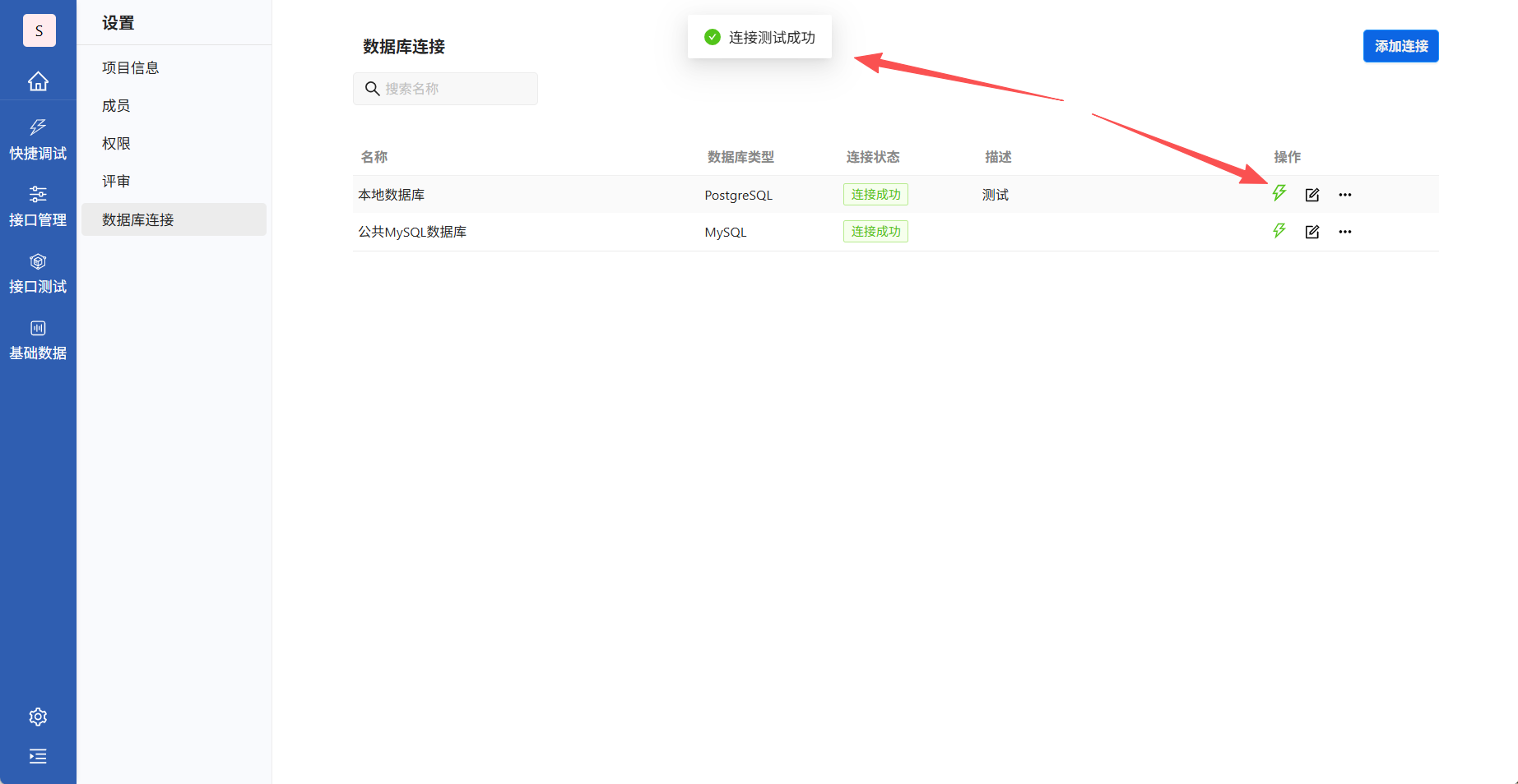 现支持PostgreSQL和MySQL两个类型。维护数据库信息后,在数据库列表可验证数据库连接。