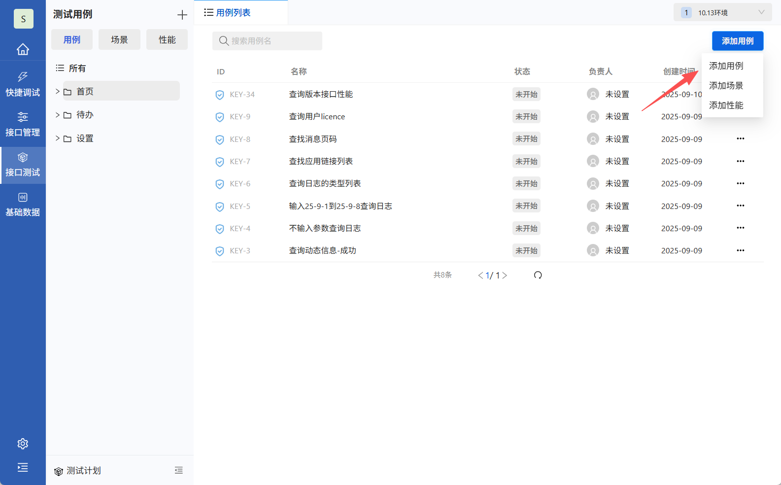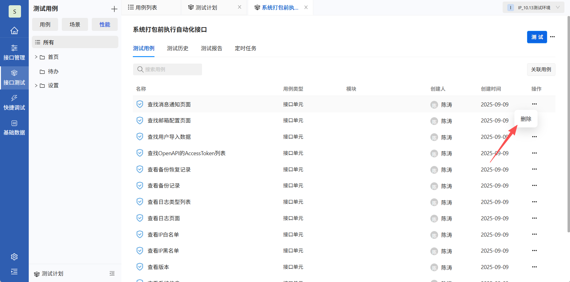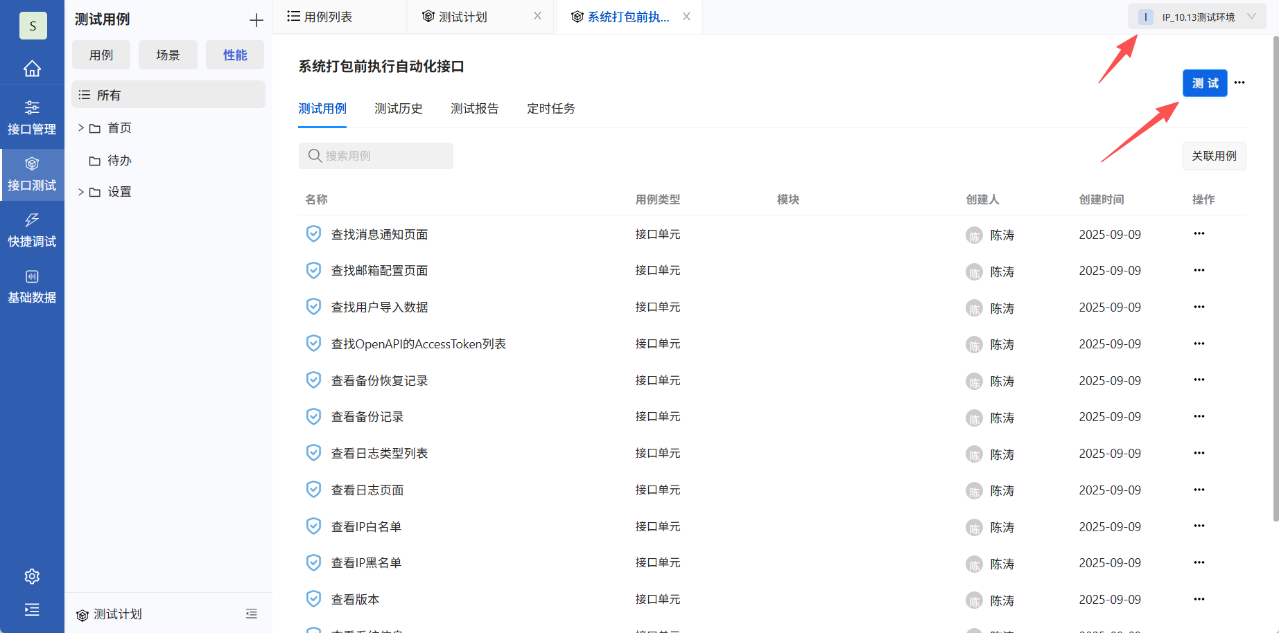 在测试计划中选择环境,点击测试,执行测试计划所有用例。