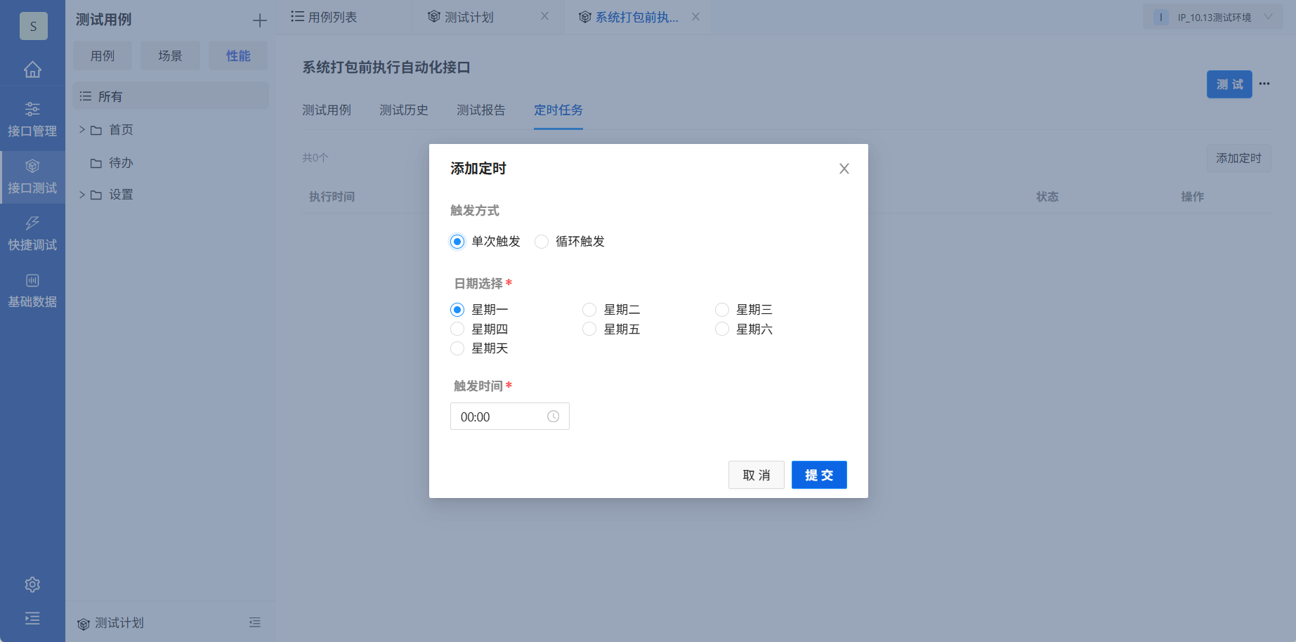 - 接口测试计划:批量手动/定时执行接口单元测试用例(接口场景用例)。