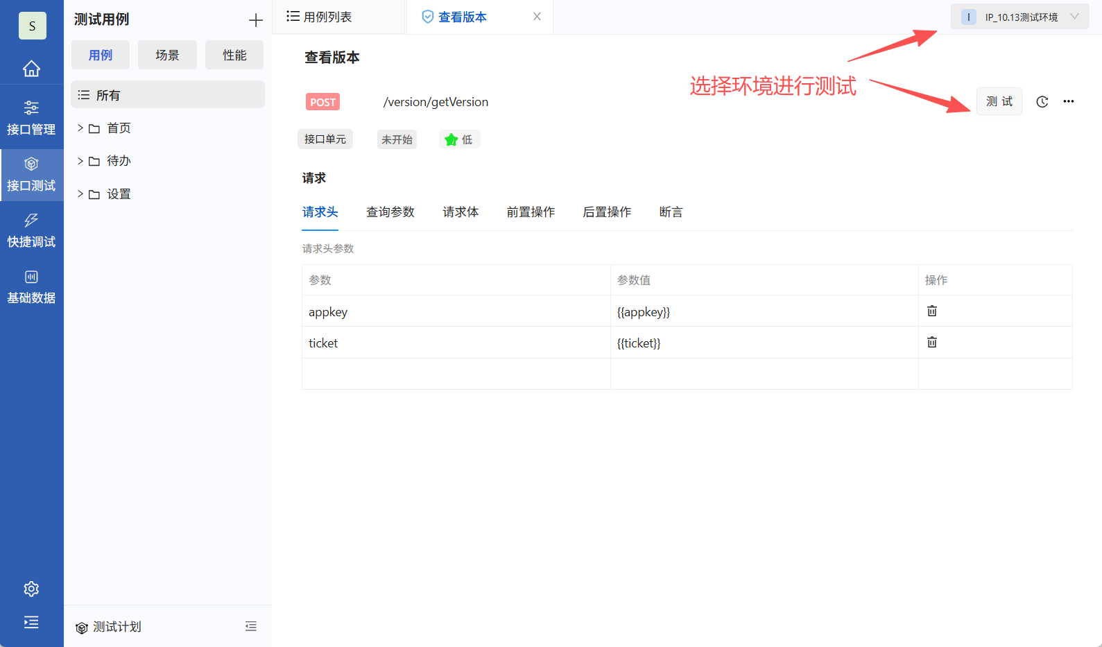 进入接口单元用例,选择测试环境进行测试。