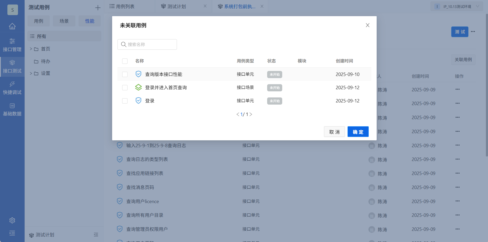 新增测试计划成功之后,在测试计划列表可以看到新增的测试计划,点击测试计划名称,进入测试计划详细,点击关联用例,可以将用例库中的接口用例(接口单元、接口场景),批量的添加到测试计划中。