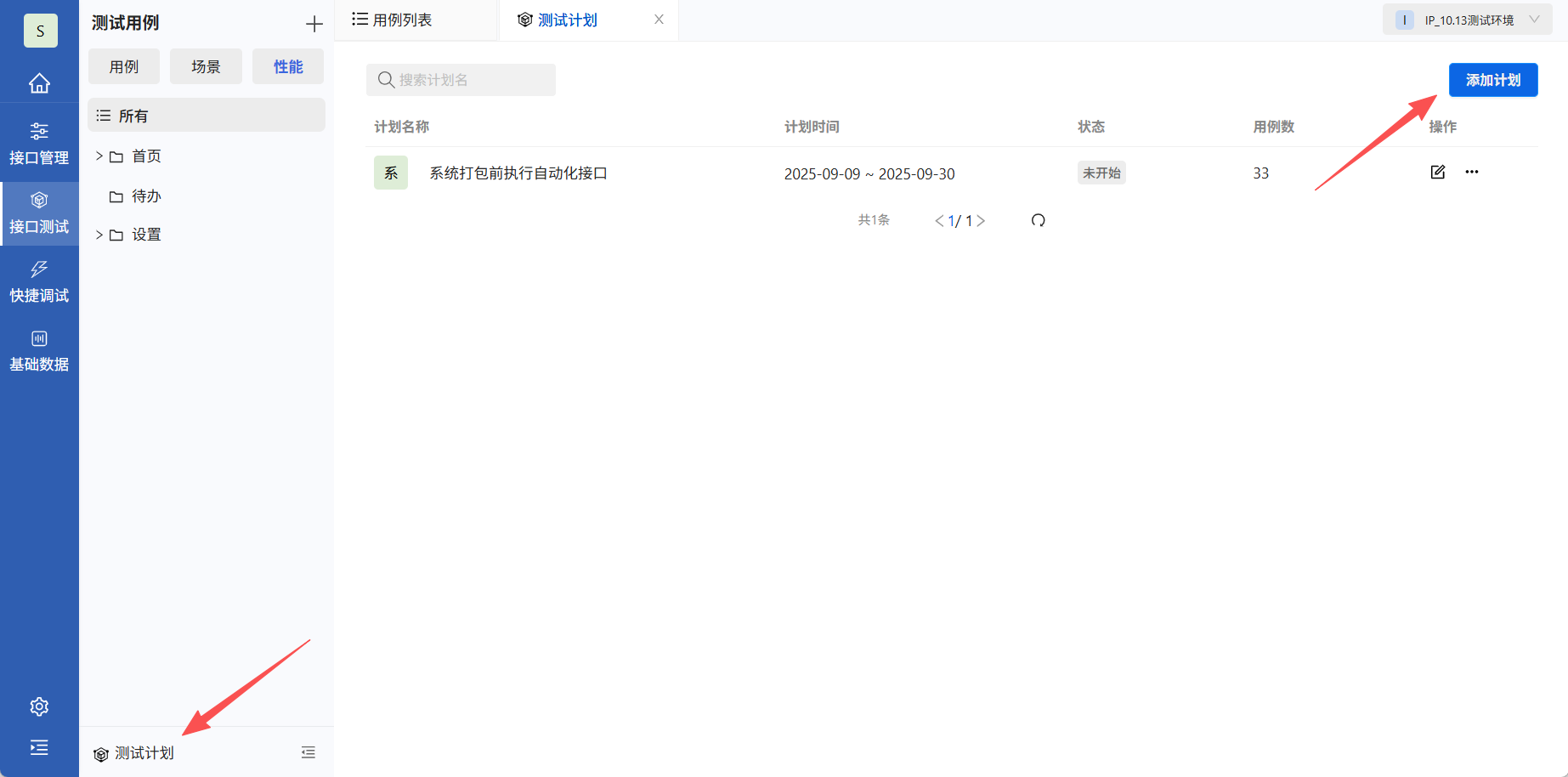 在项目详情点击接口测试→测试计划→添加计划。
