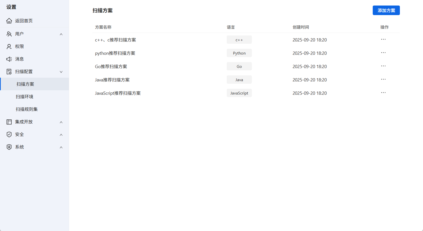 可自定义扫描方案,目前支持检测语言Java、JavaScript、Go、Python、C++等。