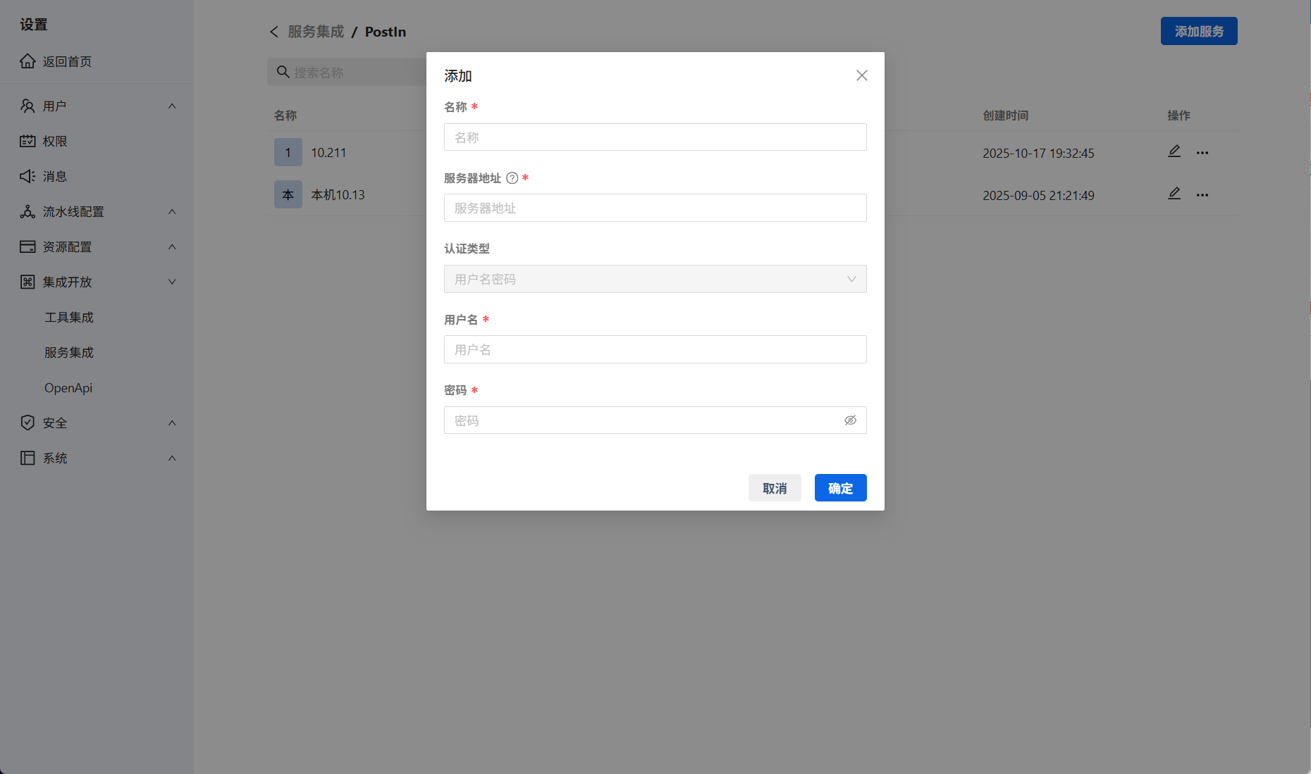 流水线配置PostIn任务之前,需要添加PostIn服务集成,在系统设置→集成与开放→服务集成页面添加相关服务。授权类型选择PostIn、填写名称、服务地址、认证类型(用户名密码、密钥)、用户名、密码。