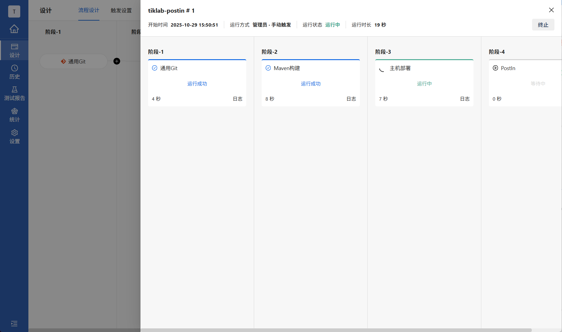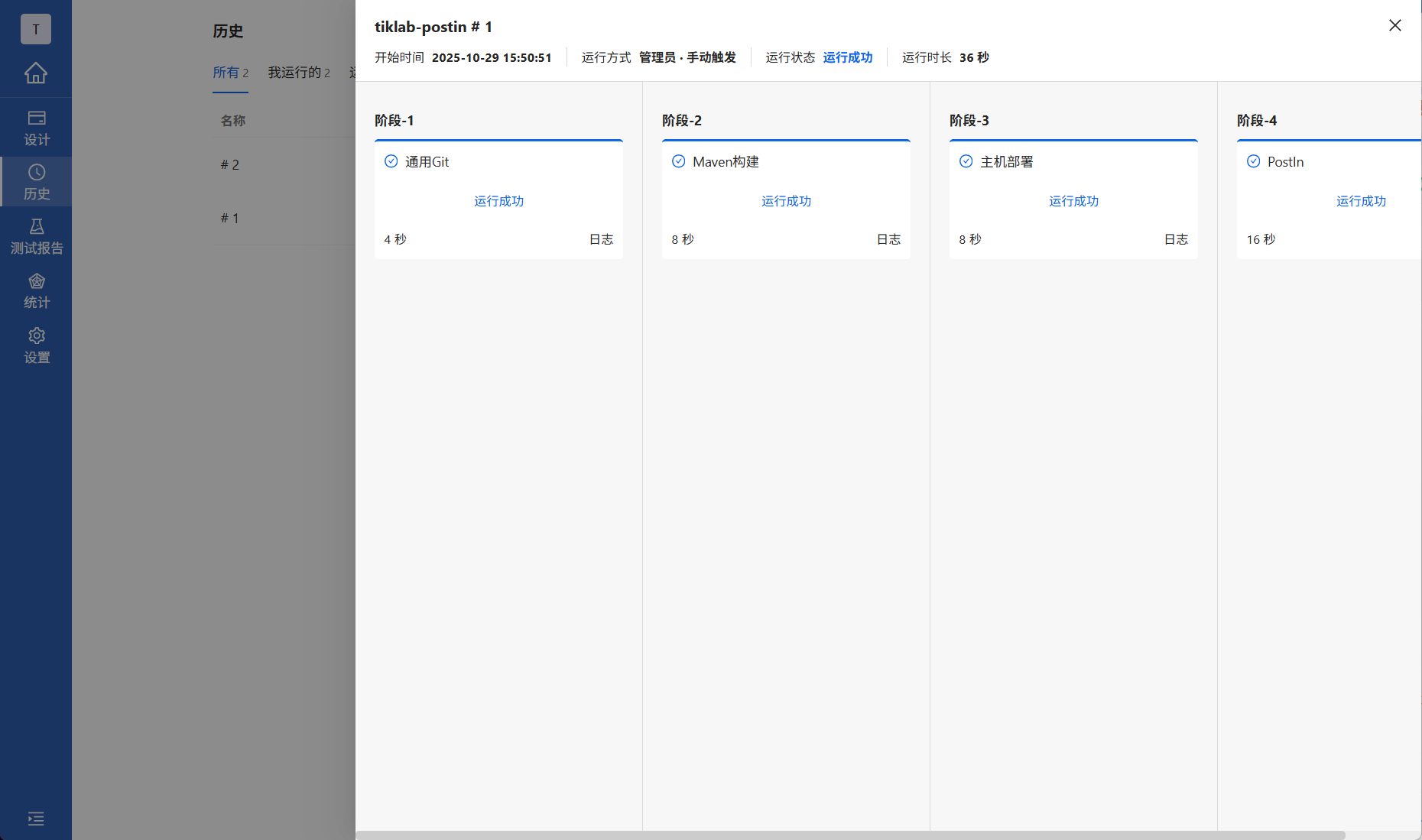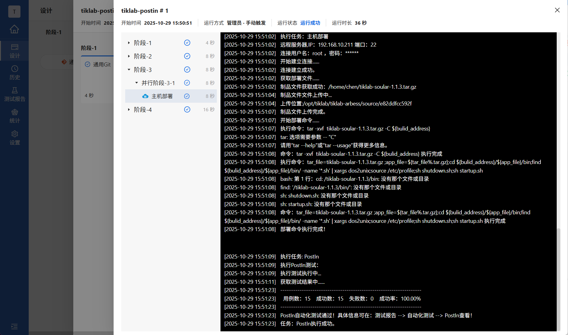 至此,使用Arbess成功搭建流水线,克隆GitLab源码、构建并部署主机环境,使用PostIn自动化测试。