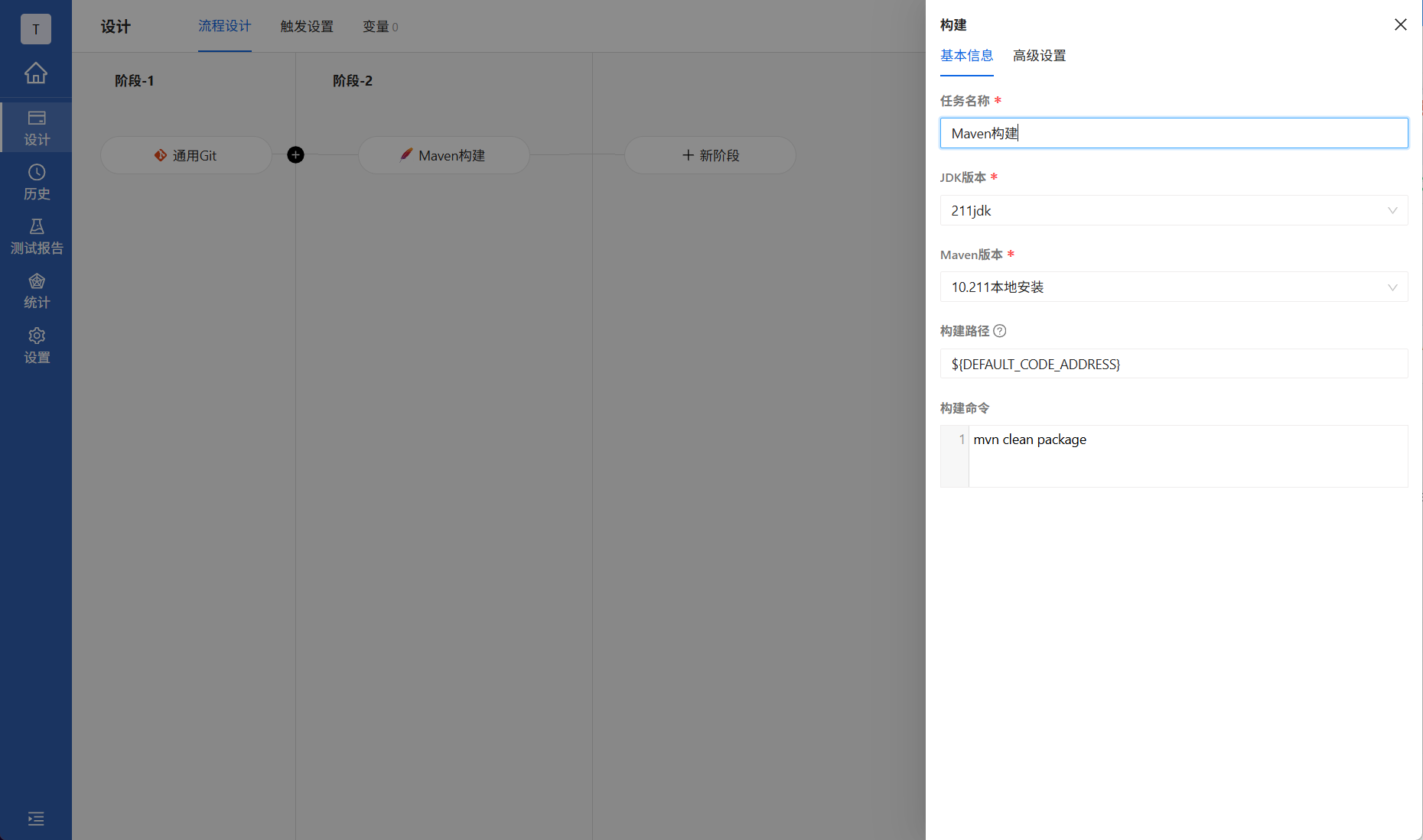 添加构建安装包任务。根据代码构建方式选择Maven构建,点击新阶段→构建→Maven构建。输入构建信息,输入完成后,点击空白处进行保存。