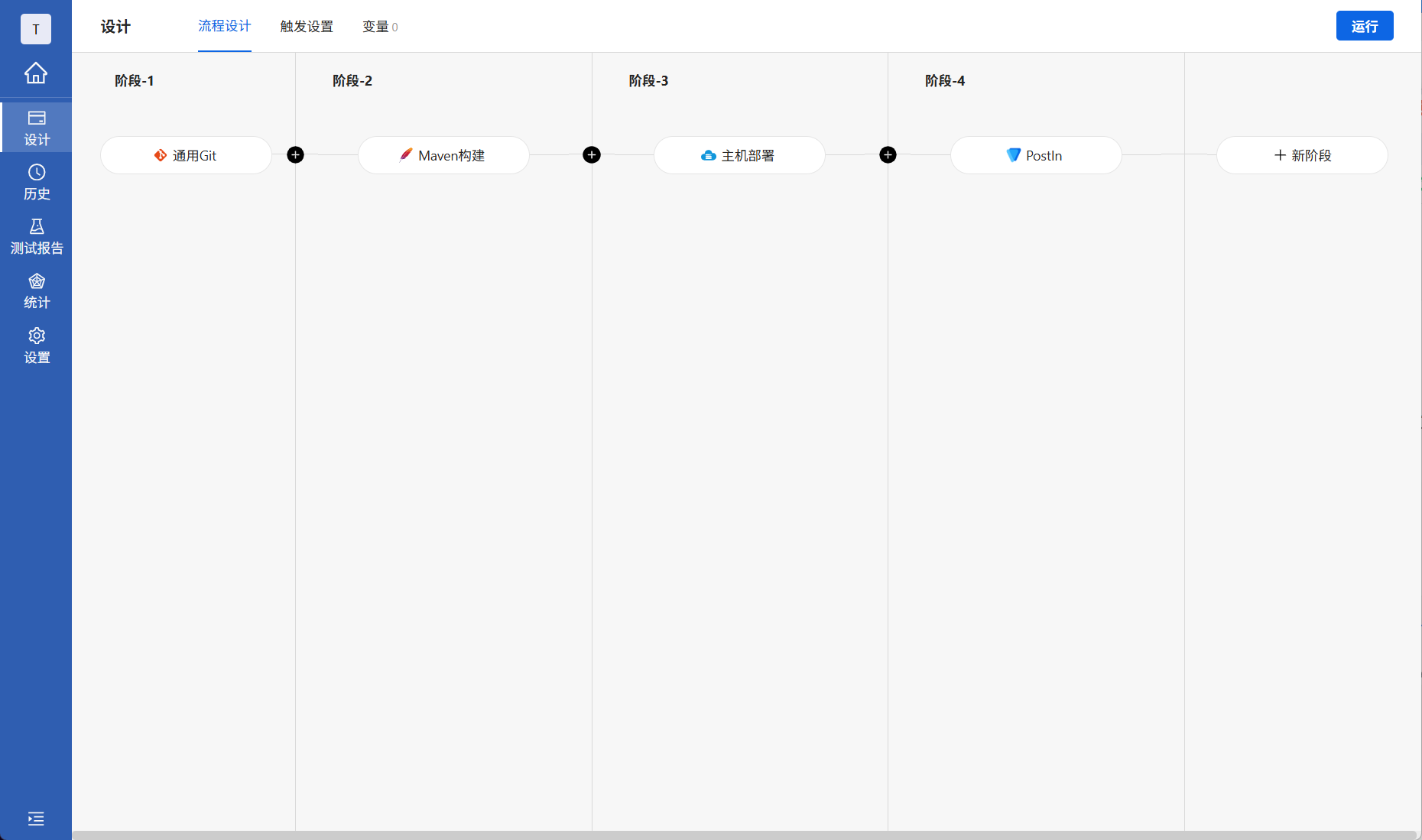 流水线设计完毕之后,Arbess支持自动触发、Webhook触发、手动触发三种运行模式。点击右上角“运行”按钮,手动触发流水线。