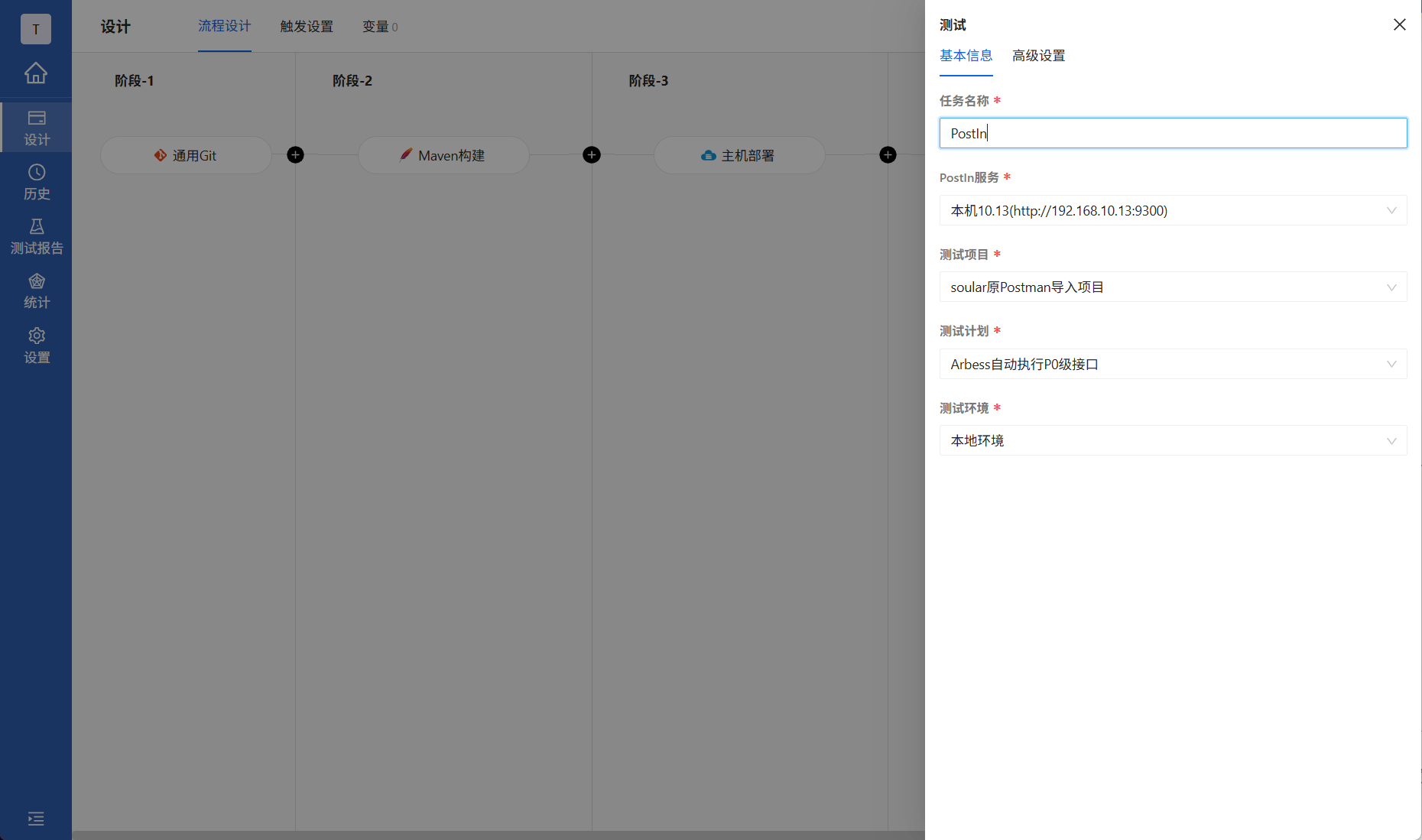 服务配置完成后,进入流水线设计页面,点击新阶段→测试→PostIn自动化测试。添加成功之后,弹出自动化测试的配置。
