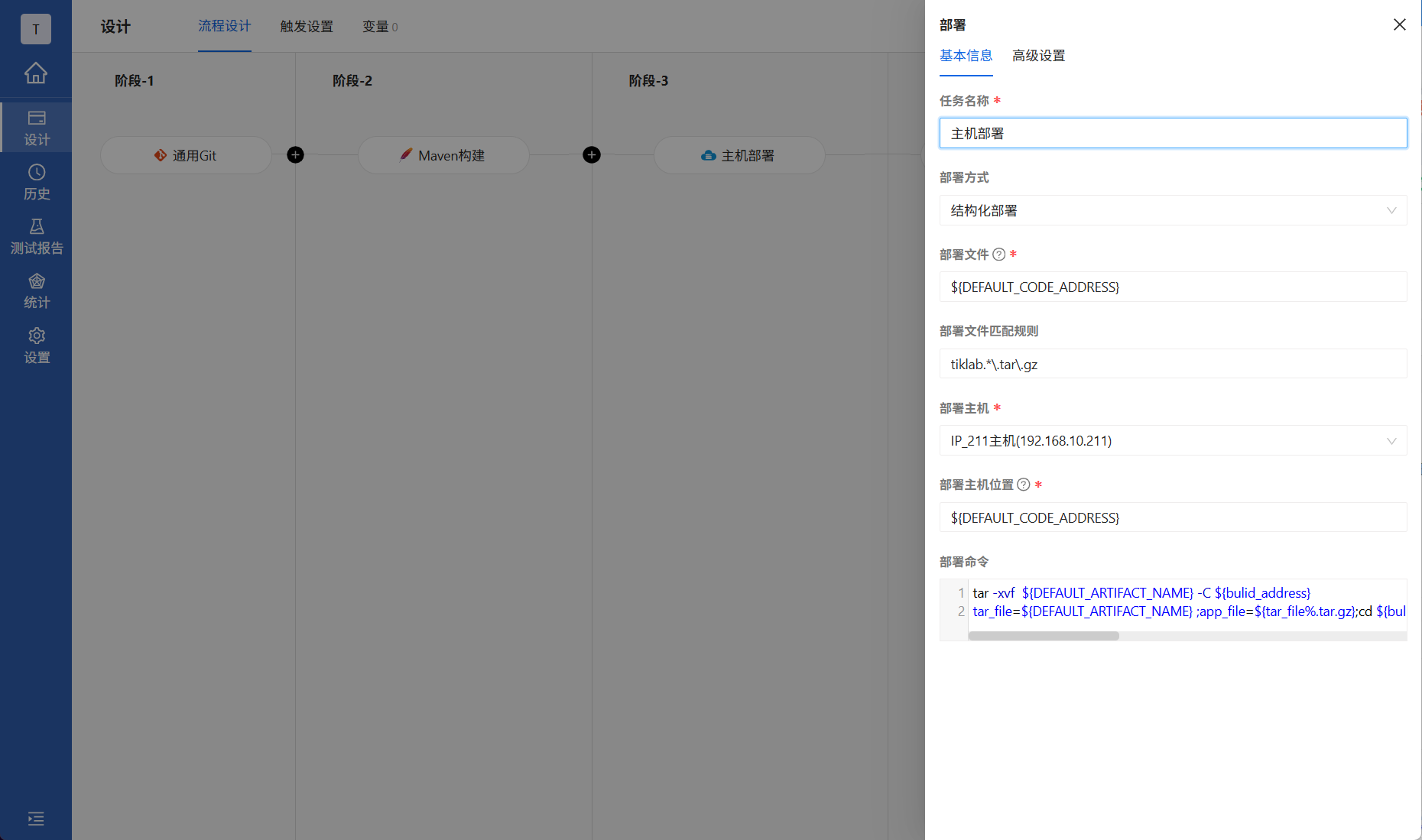 点击新阶段→部署→主机部署,输入部署信息,主机地址选择新添加的主机组。部署的内容可以使用变量,添加变量后使用${变量名称}进行引用,输入完成后,点击空白处进行保存。