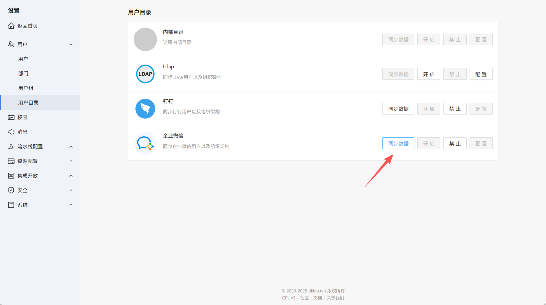 配置成功后点击开启,此时同步数据的按钮会亮起,点击同步数据,就会把企业微信下的用户信息同步到Arbess。