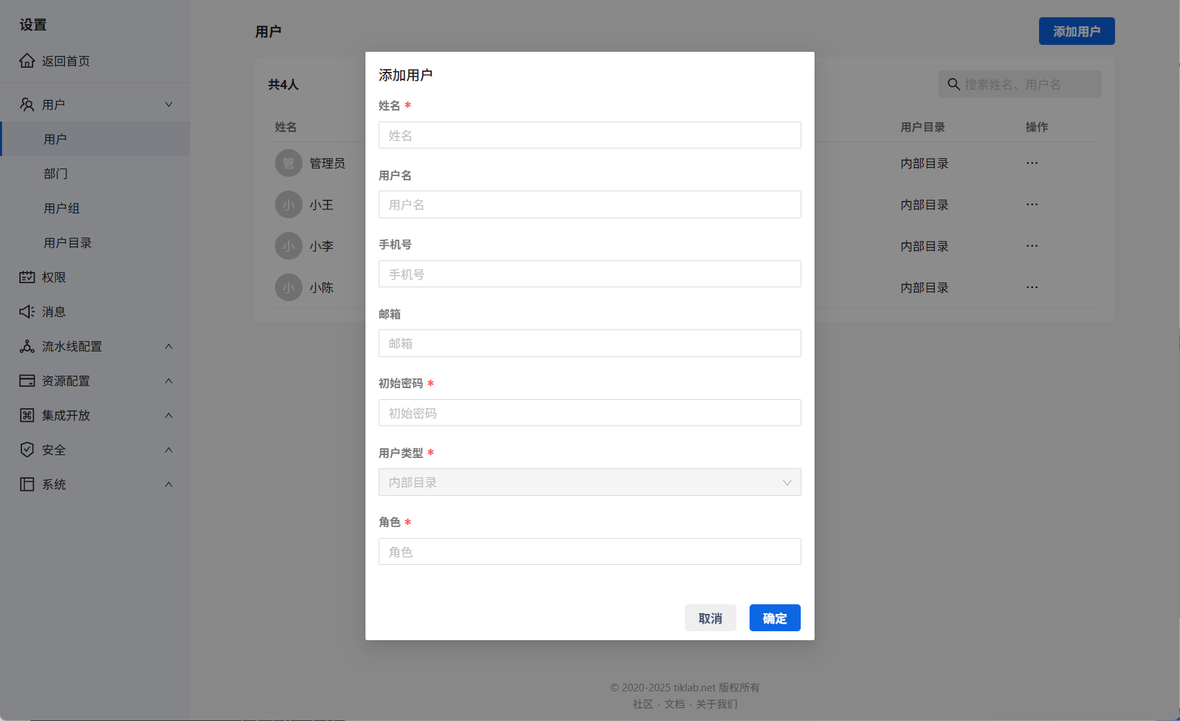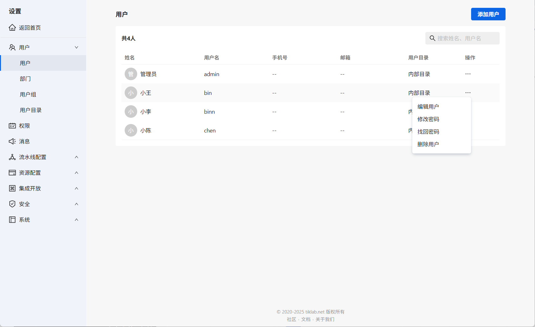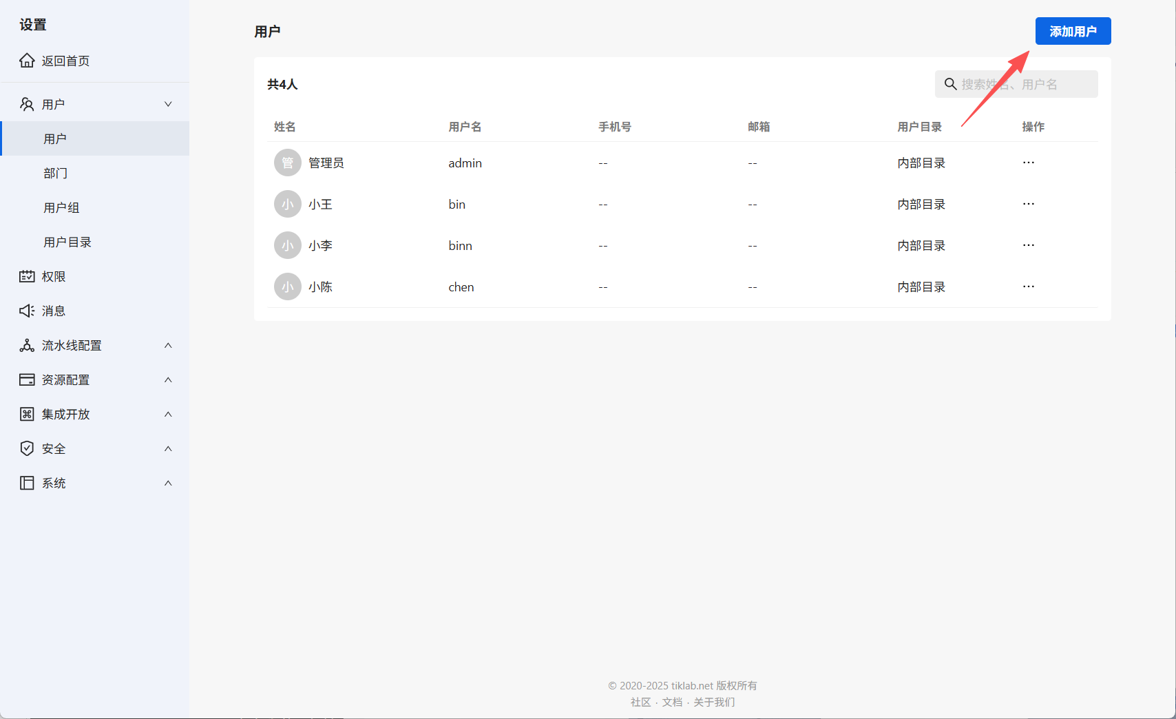 系统启动成功后,需要添加系统用户,依次点击系统设置->用户与权限->用户,在用户页面对系统用户进行管理。系统内置管理员用户,无法删除。