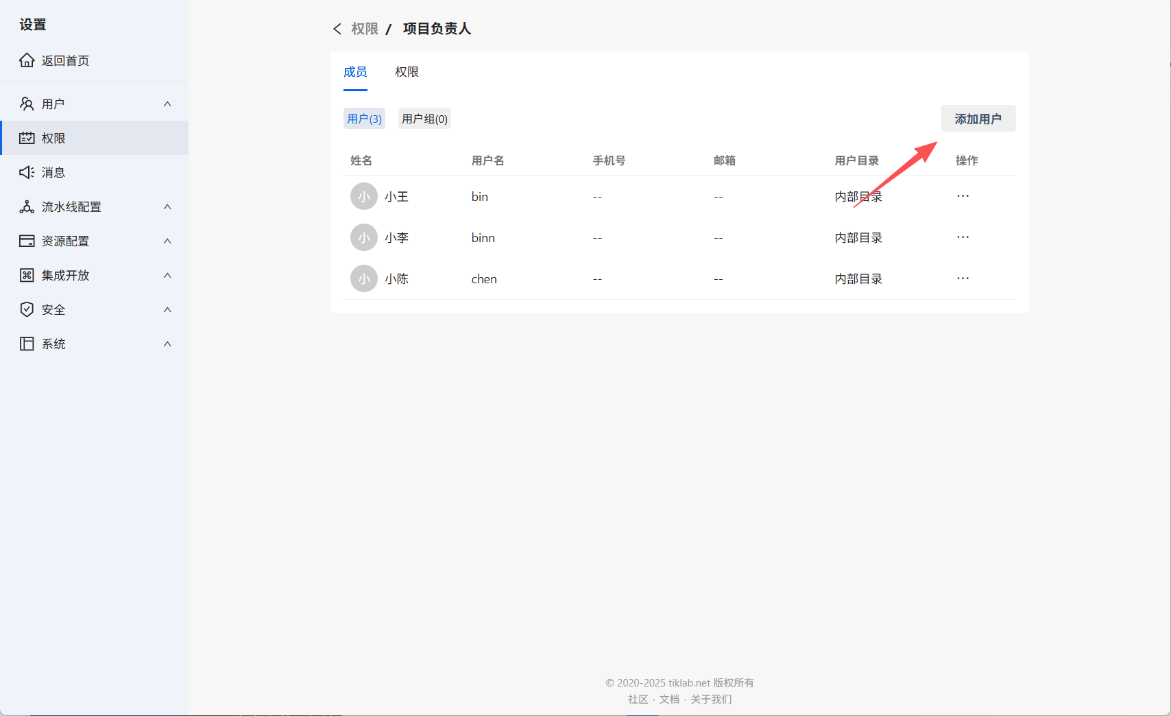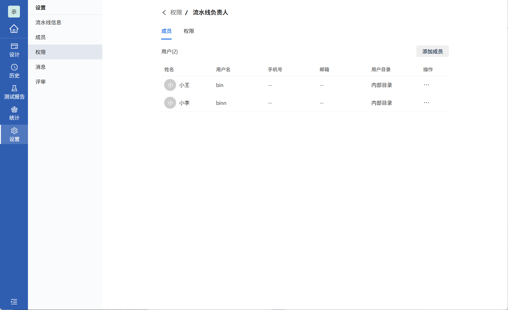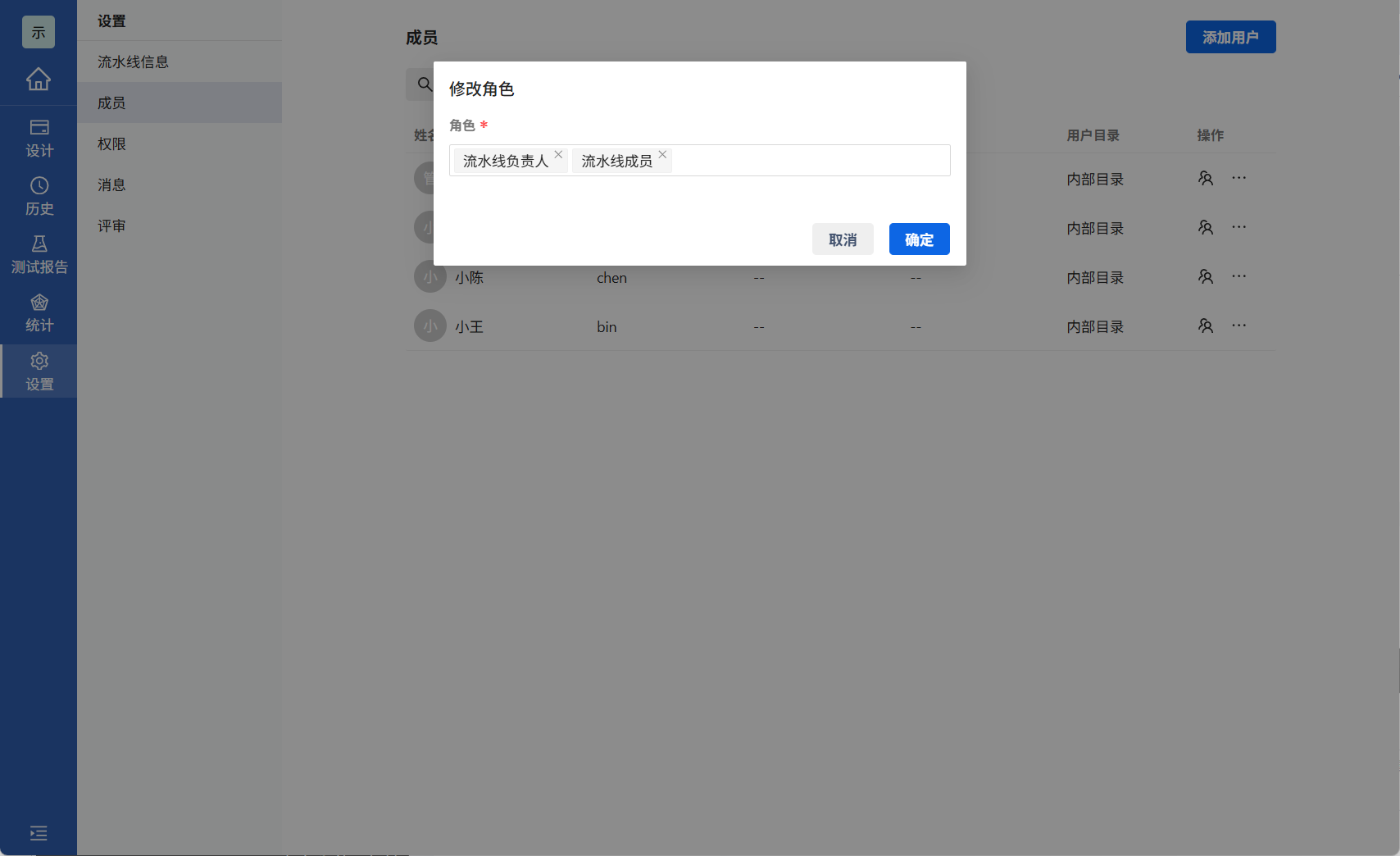 例如添加自定义角色“流水线负责人”,点击角色名称,可编辑“流水线负责人”的用户。