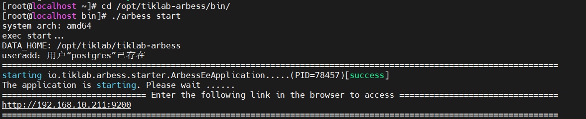 - 启动,系统默认安装路径为/opt目录,进入/opt/tiklab-arbess/bin目录下,执行./arbess start即可启动成功。