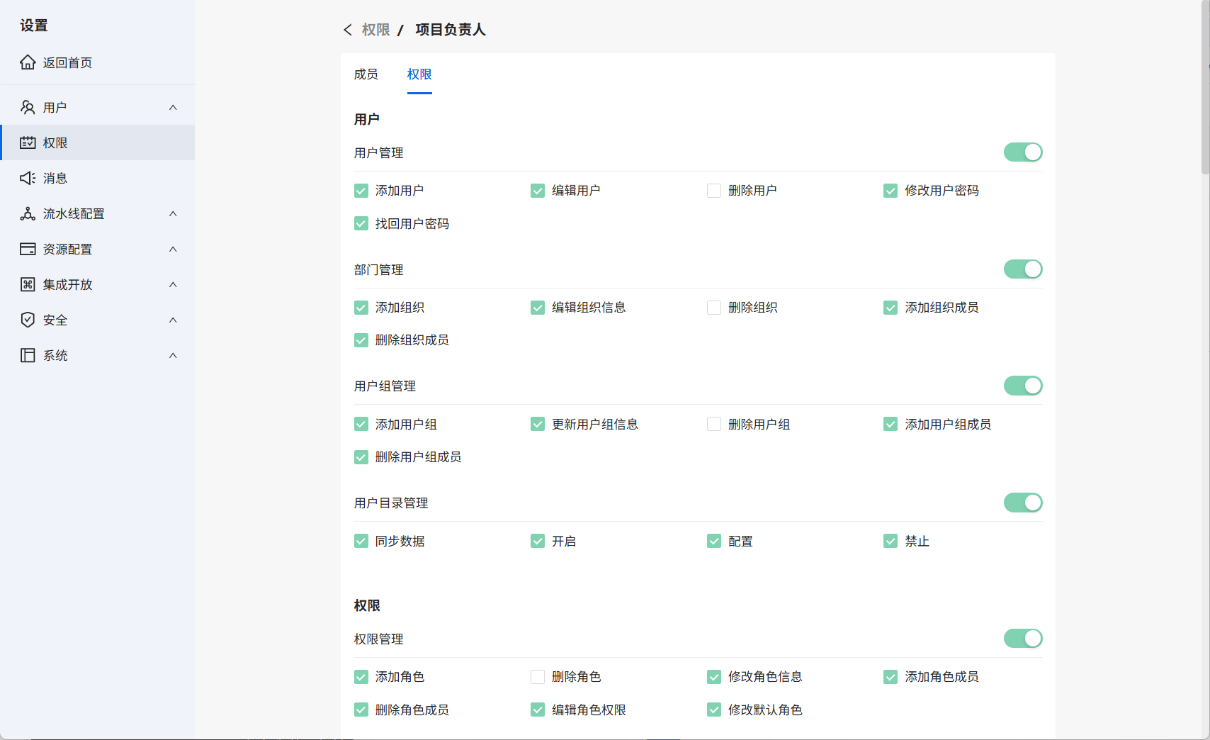 例如添加自定义角色“项目负责人”,点击角色名称,可编辑“项目负责人”的用户。