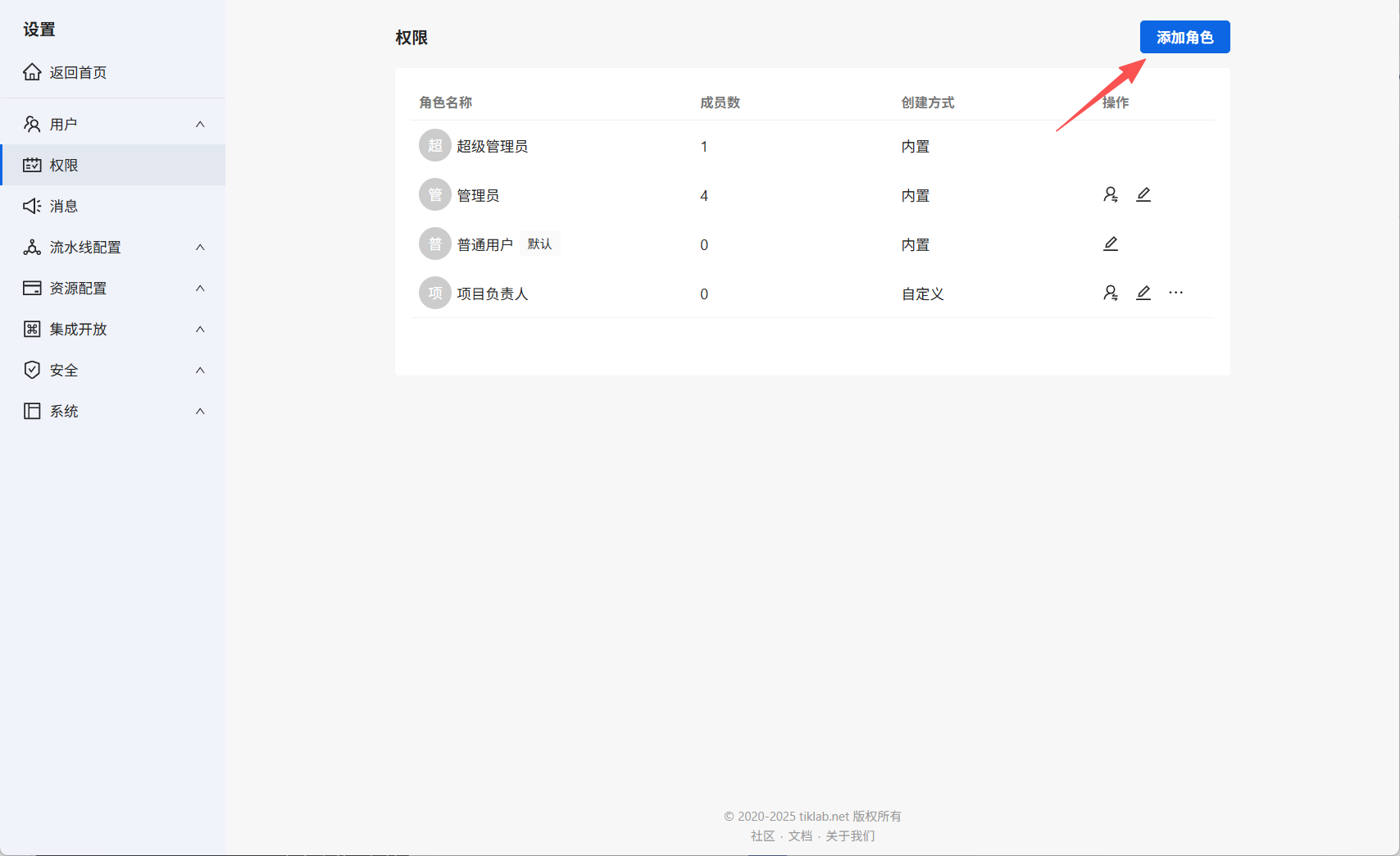 用户添加完成后,进入系统设置→权限,添加自定义角色。