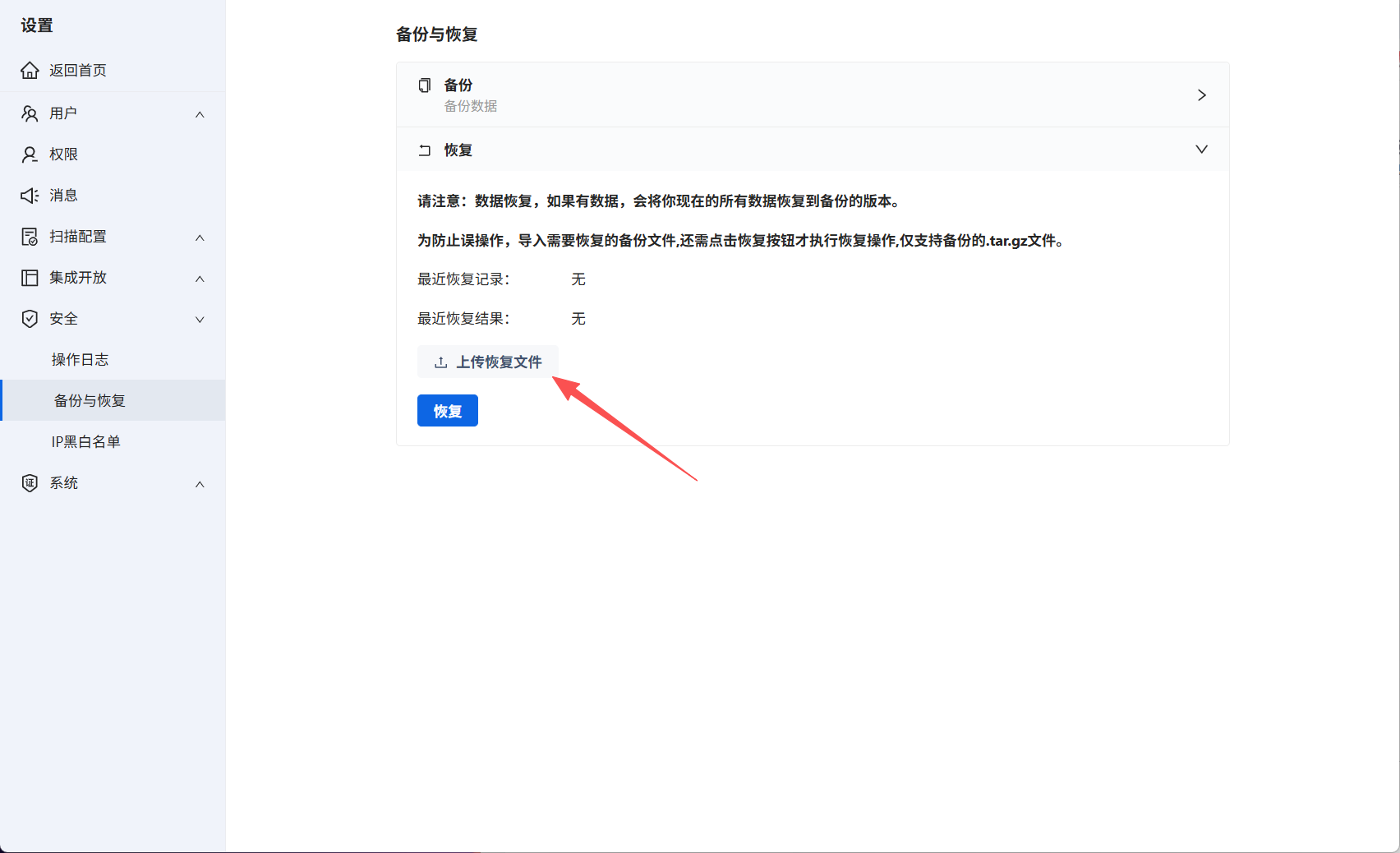 注意:恢复数据会将当前数据恢复到上传备份包的数据,请谨慎操作!