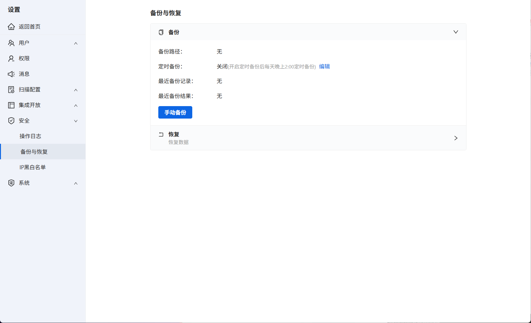 进入系统设置→安全→备份与恢复,找到备份选项。数据备份支持手动备份或者自动备份。