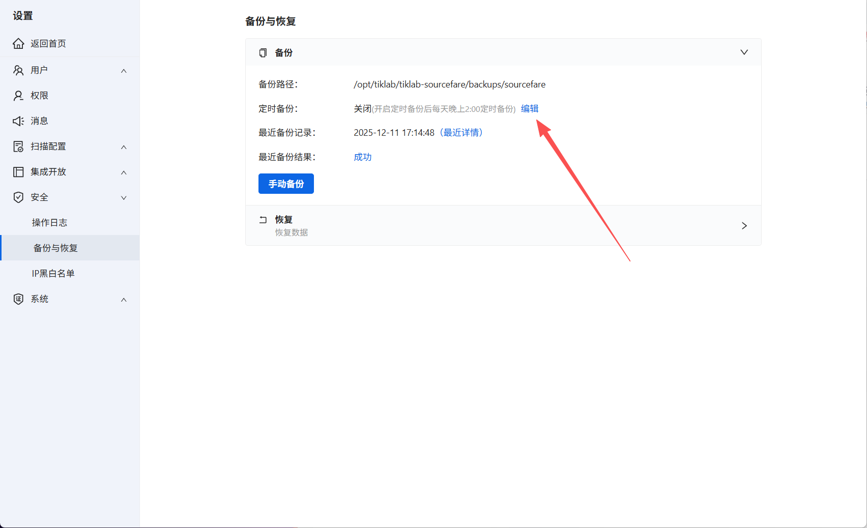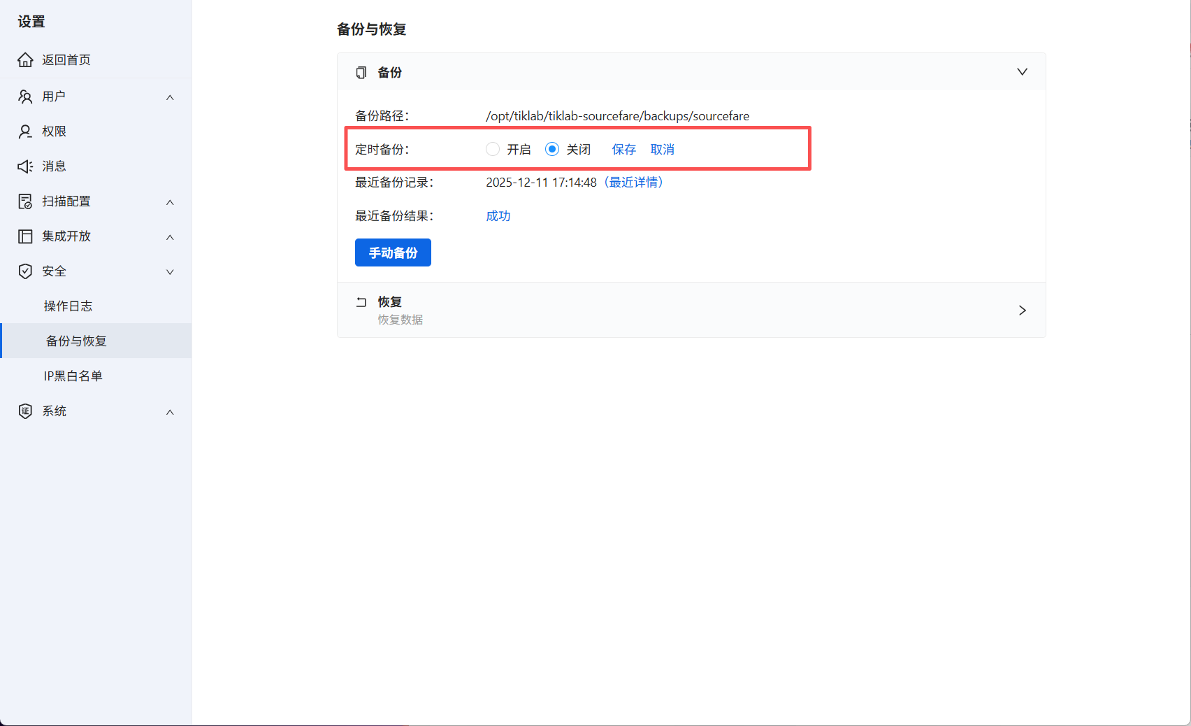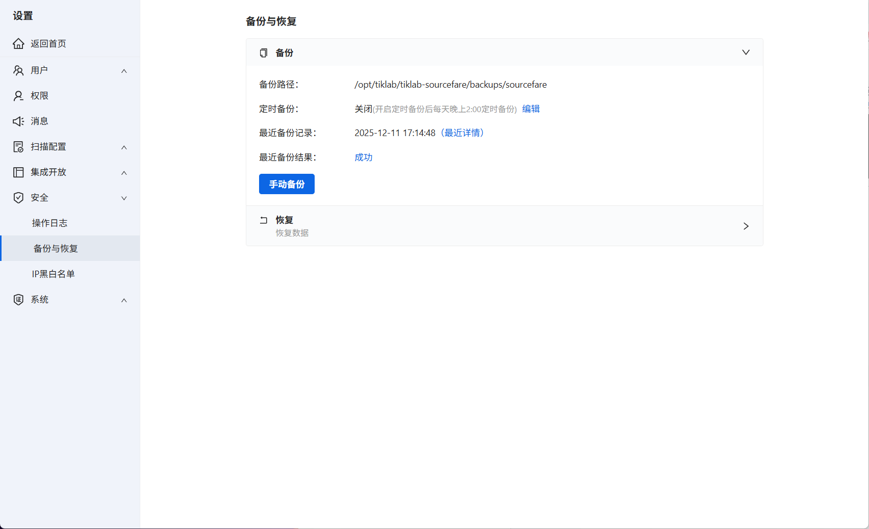 默认备份在数据目录,例如Linux备份在/opt/tiklab/tiklab-sourcefare/backups/sourcefare/backups/下,成功备份后,在备份恢复界面可显示最近备份的记录。