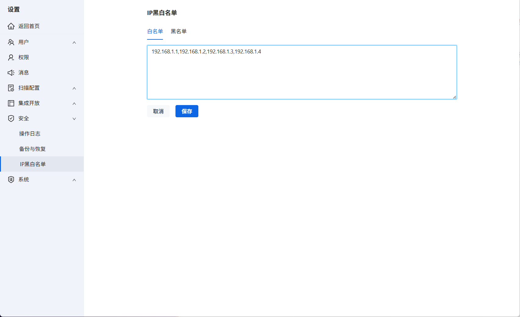 支持设置访问系统的IP黑白名单。