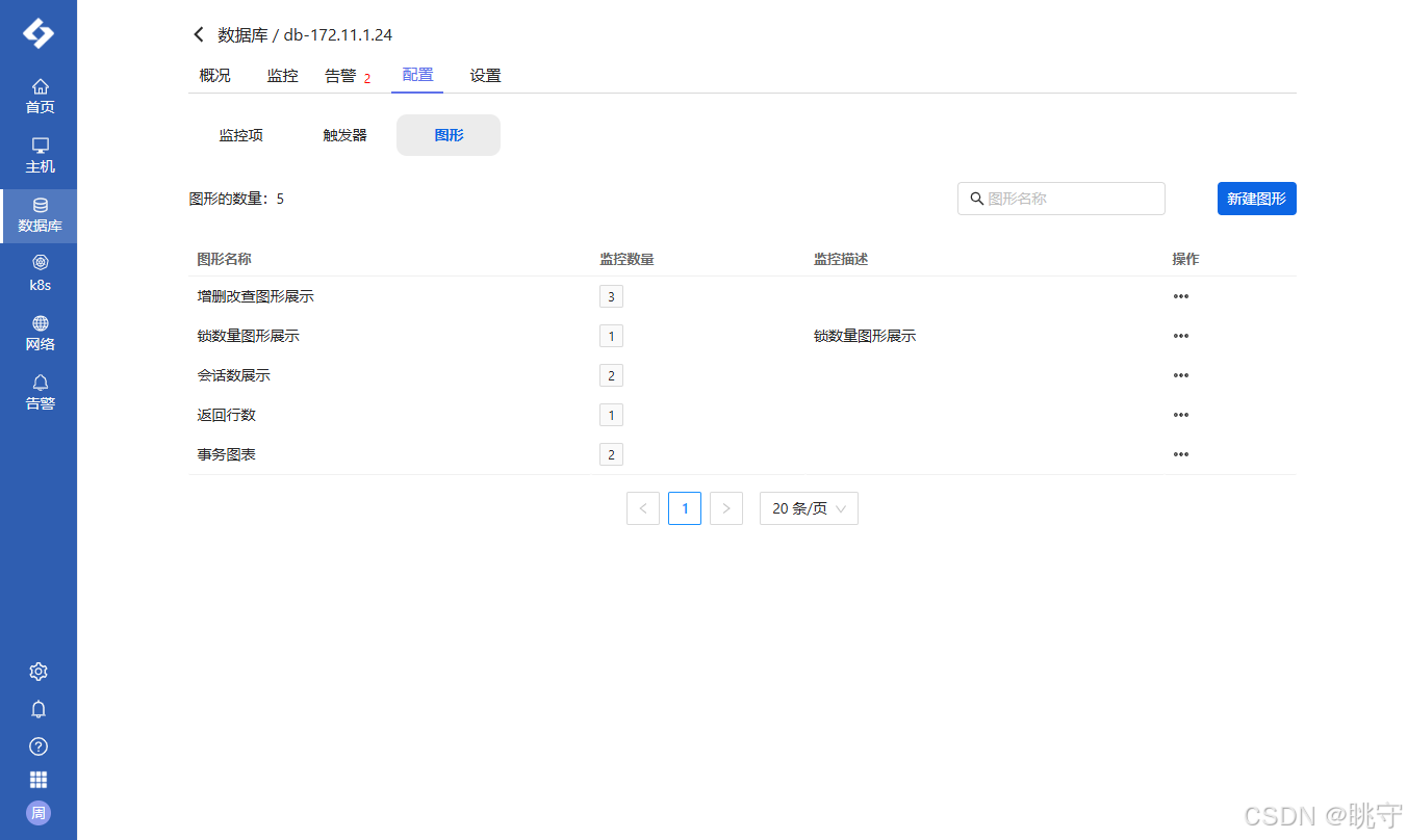 对数据库监控当中图形展示的配置,用户可以根据自己的需求将不同的监控项放到一个图形下进行展示。数据库监控列表 --> 点击监控的数据库名称 --> 配置 --> 图形 --> 新建图形。