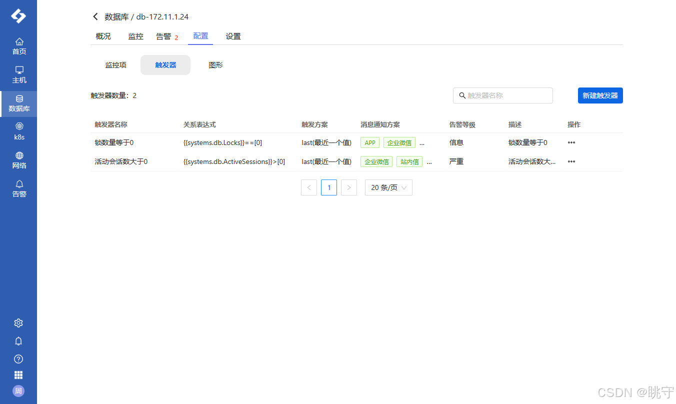 数据库监控列表 --> 点击监控的数据库名称 --> 配置 --> 触发器 --> 新建触发器。