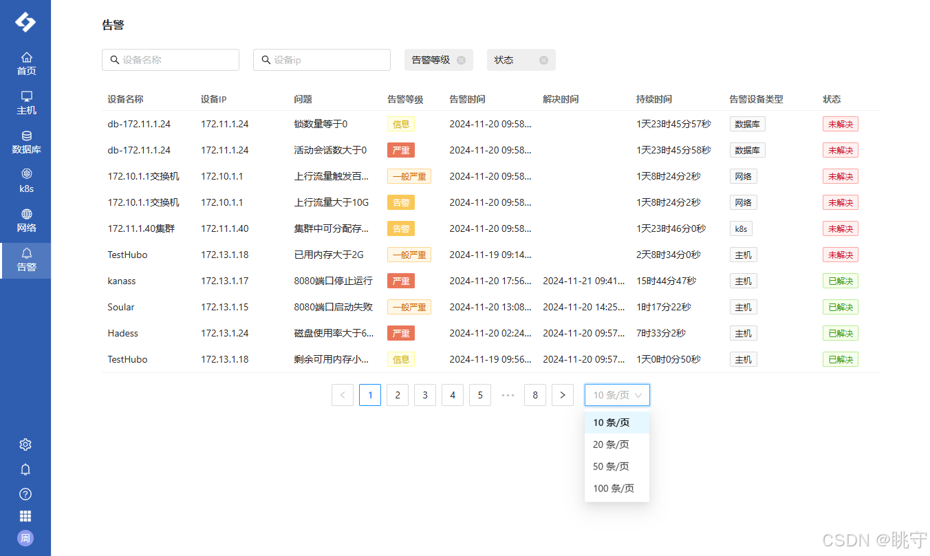 告警是出现问题的通知,目前有灾难、严重、一般严重、告警、信息、未分类六个等级,能够提示用户哪些主机出现了问题。点击状态当中的“未解决”可以扭转状态为“已解决”。每个模块当中有告警模块,最外侧的一级模块也有告警模块。