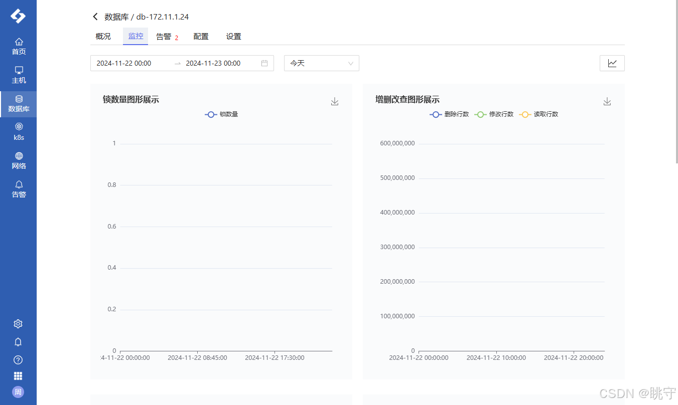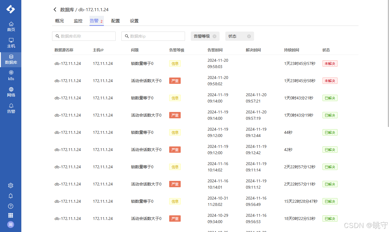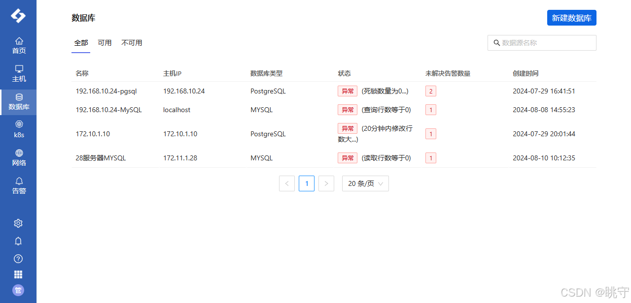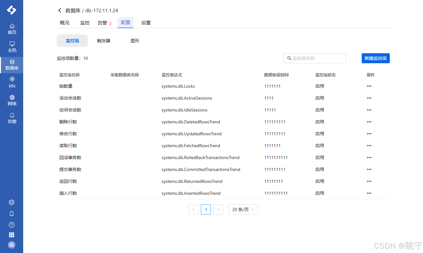 在数据库监控列表当中可以看到数据库的大概信息,是否能够检测到数据库是否能够连接,是否有告警等信息。