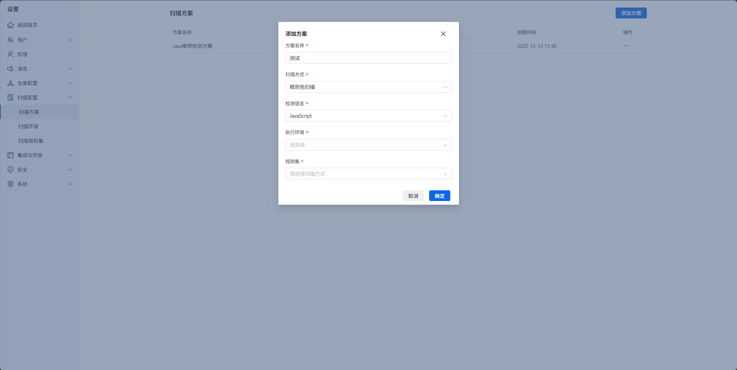 3.点开扫描配置后,点击扫描方案后打开右上角的添加方案输入对应的内容后,点击确定即可