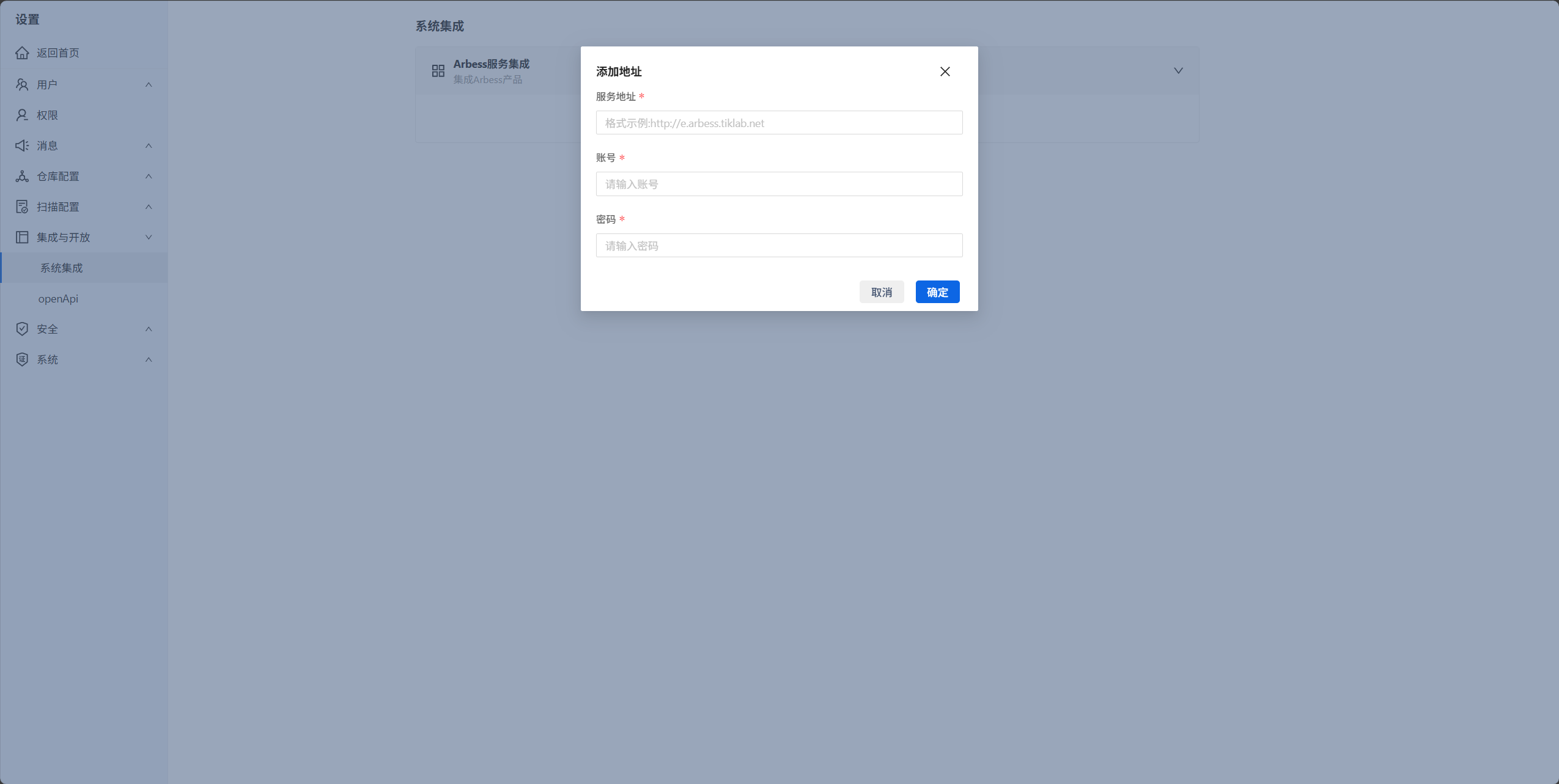 3.打开后系统会跳转至系统集成,点击添加地址输入对应的内容,点击确定即可