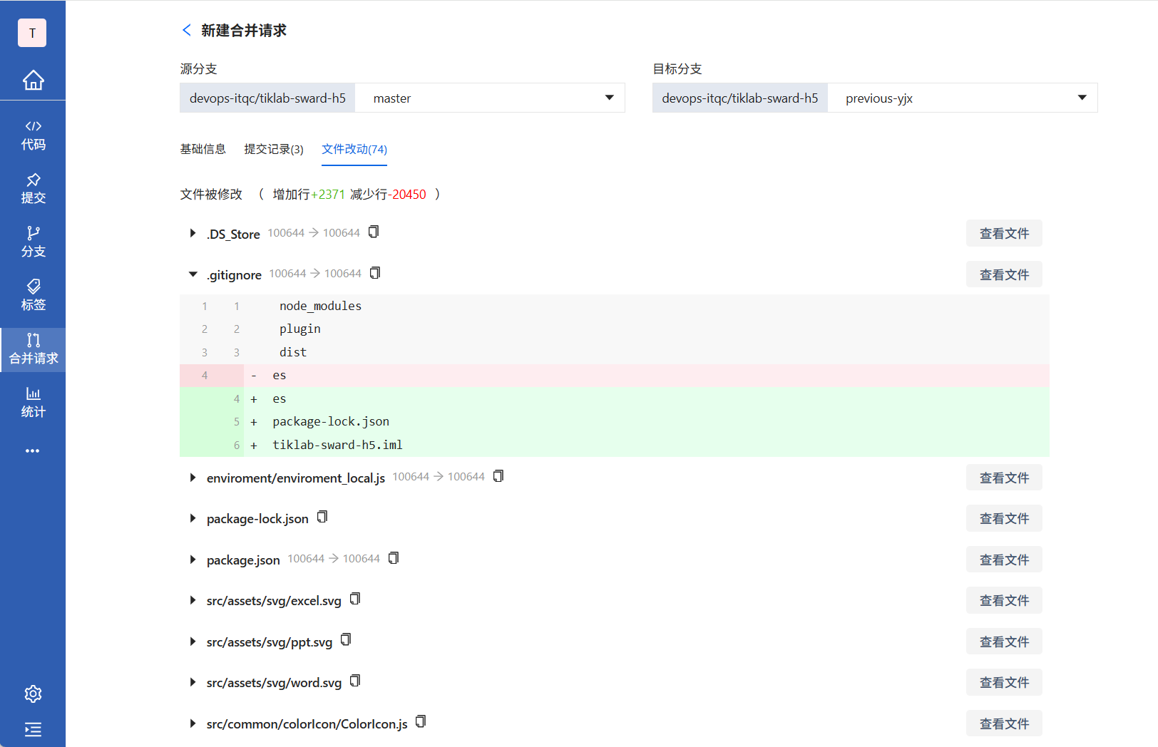 2.在新建合并请求时可在创建页面详细查看,提交记录与文件改动