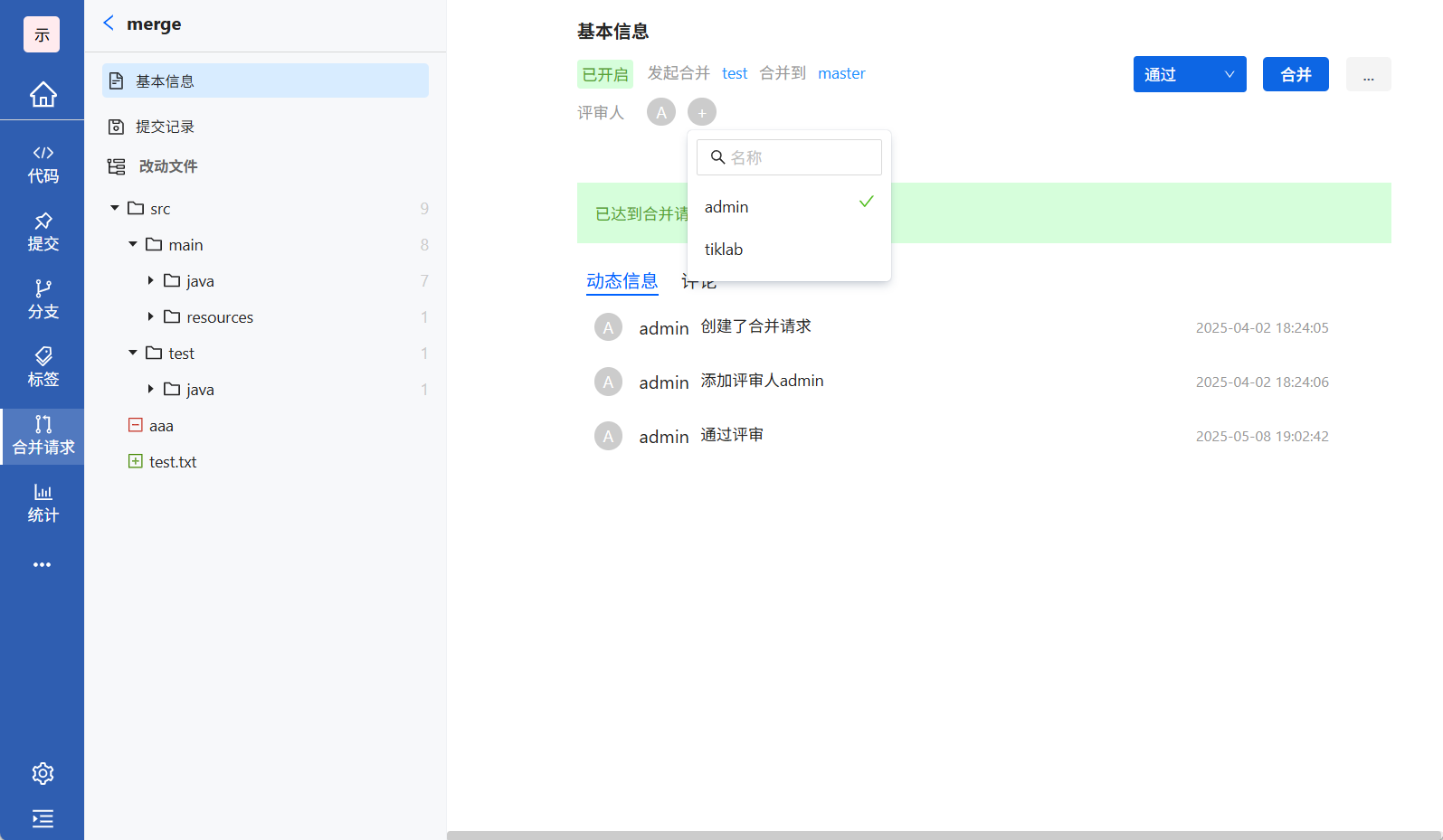 1.在创建合并评审后,可在页面添加对应该项目的管理者为评审,来进行人工的评审管控