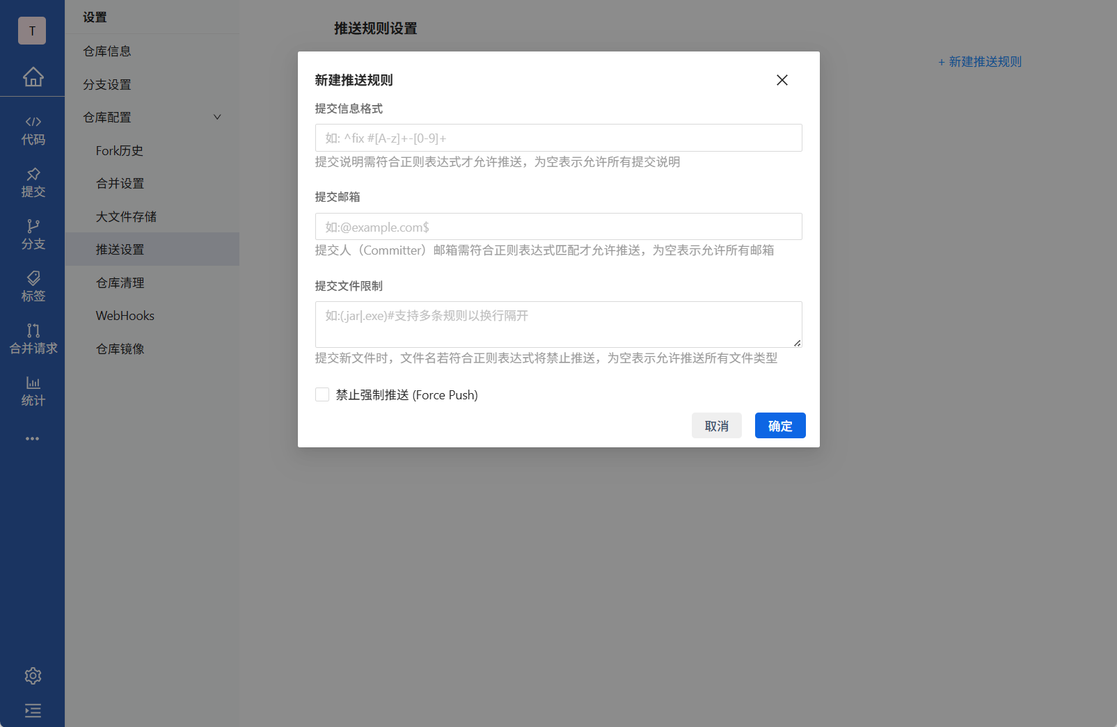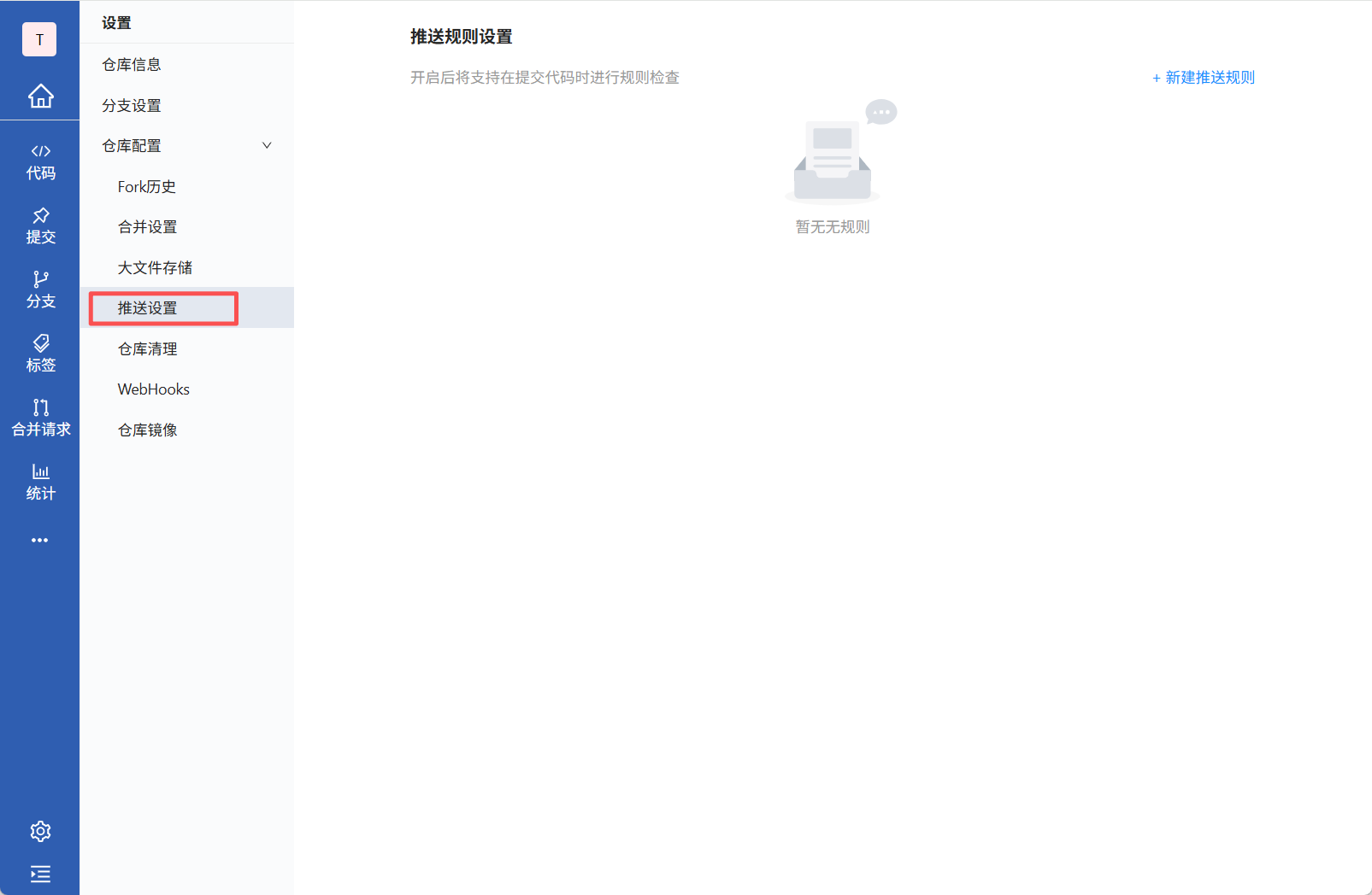 3,点击新建推送规则即可设置规则限制,这样推送时即可间接管控代码质量