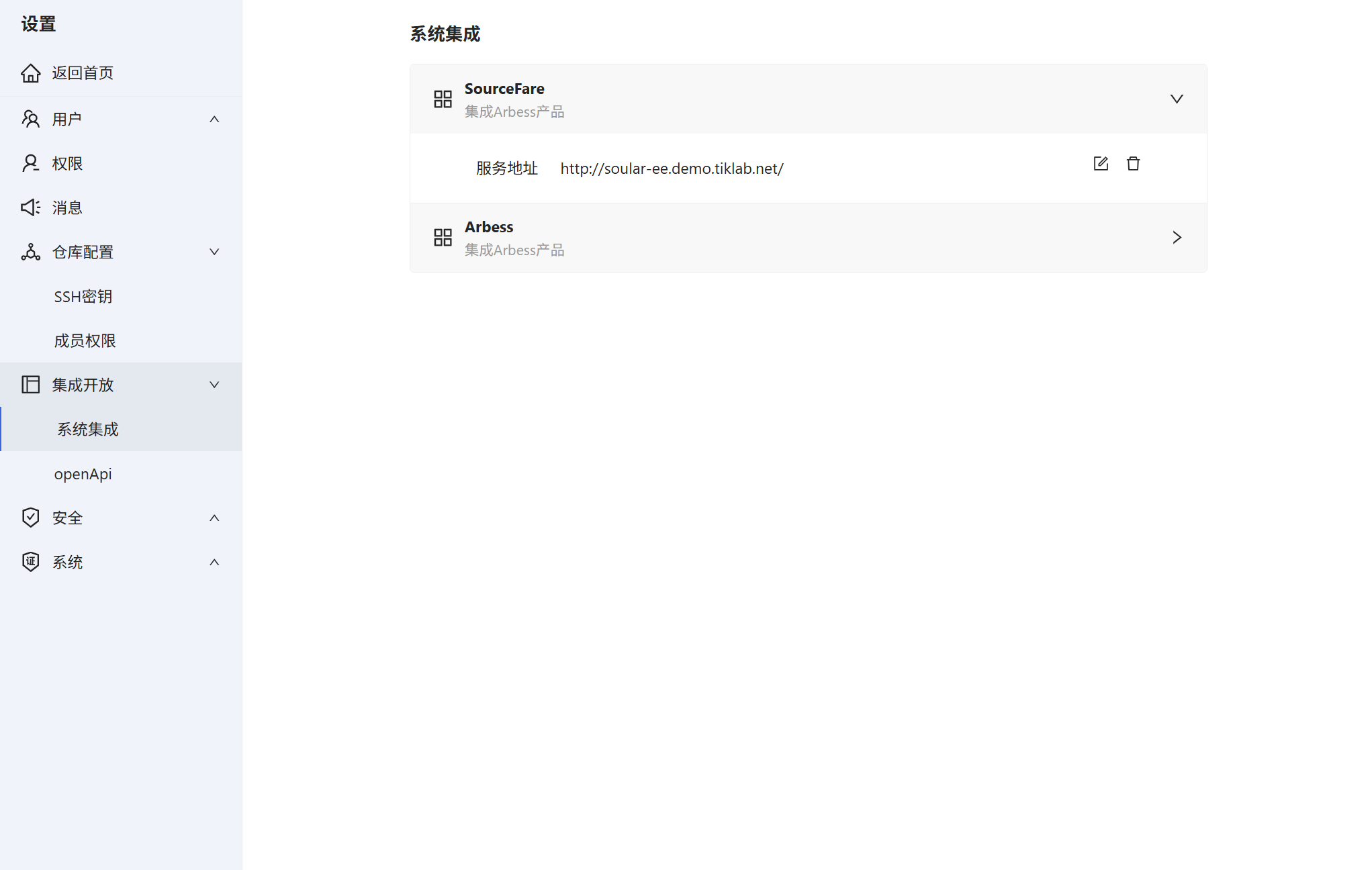 1.进入GitPuk后点击设置来到集成与开放,点击系统集成中的sourcefare输入对应内容来进行集成,sourcefare则是同理。