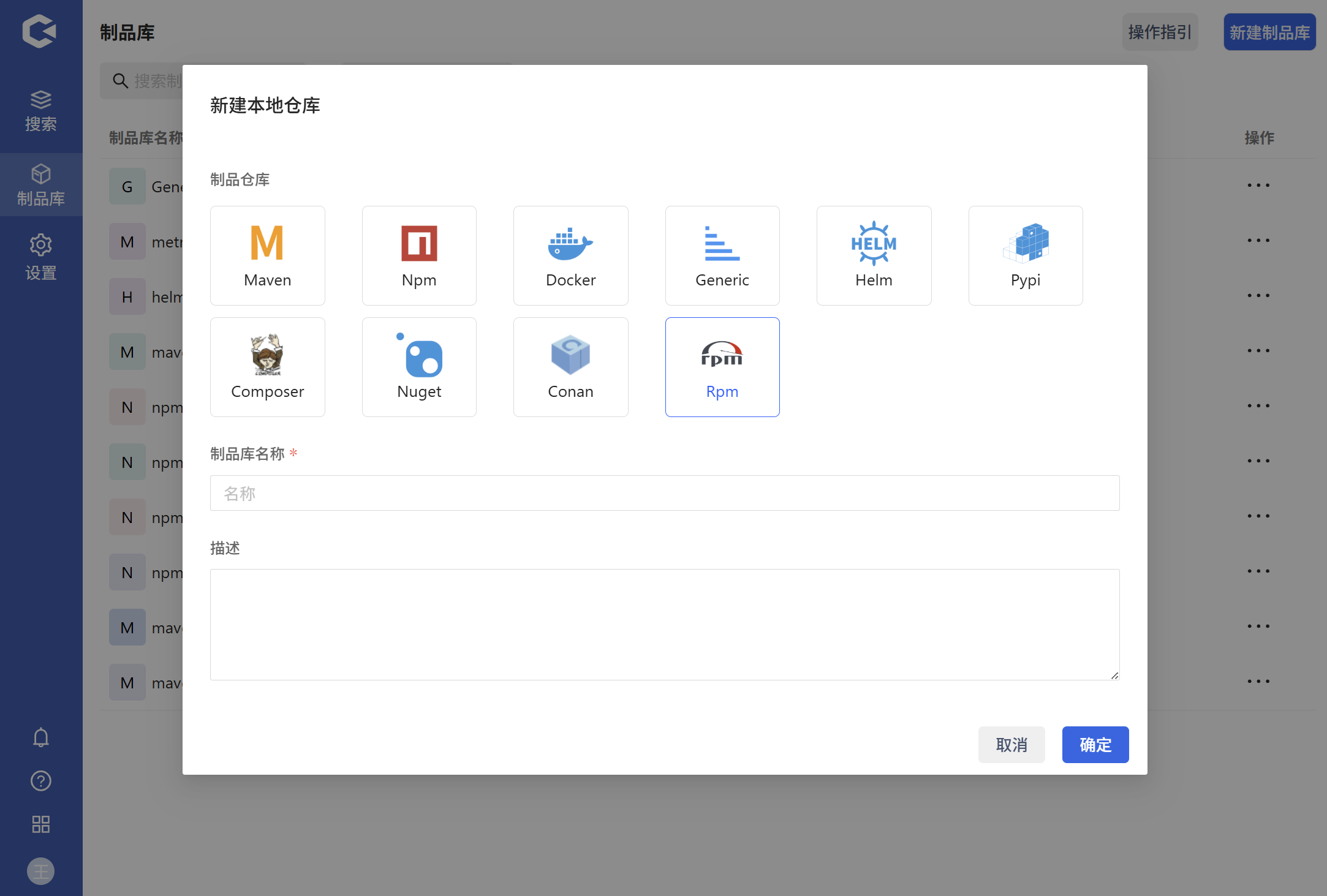 1,进入Hadess主页面后,点击右上角新建本地库,选择rpm输入对应内容点击确定即可