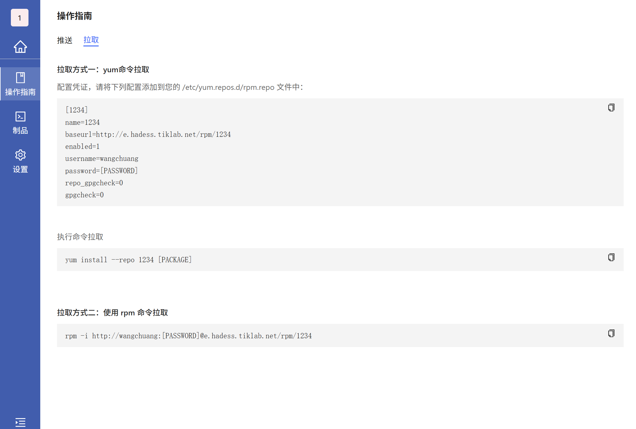 2,进入你刚刚创建的rpm制品库,点击操作指南根据操作指南上面的步骤即可。