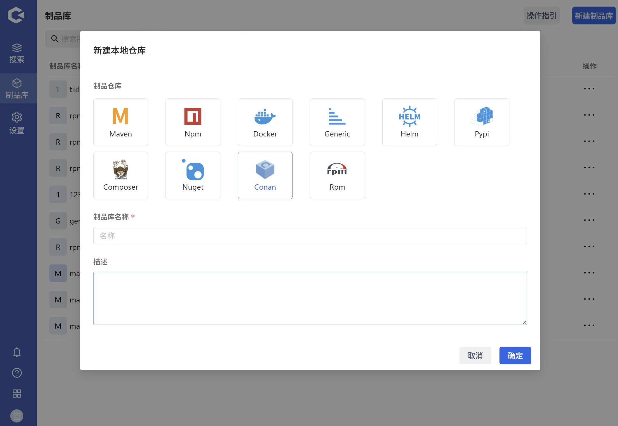 1,进入Hadess主页面后,点击右上角新建本地库,选择conan输入对应内容点击确定即可