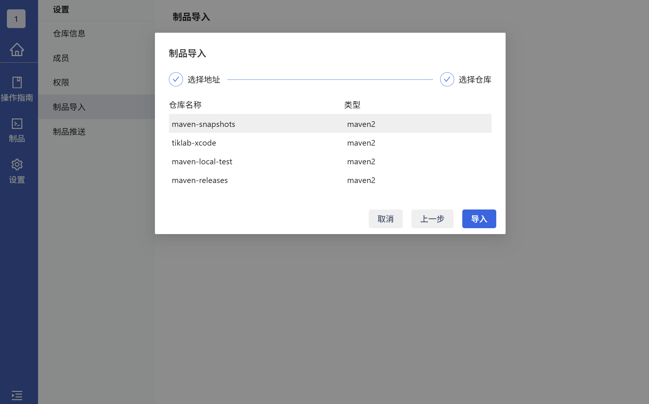 4,进入设置页面后,点击制品导入选择Nexus导入。选择好地址和仓库后点击导入即可