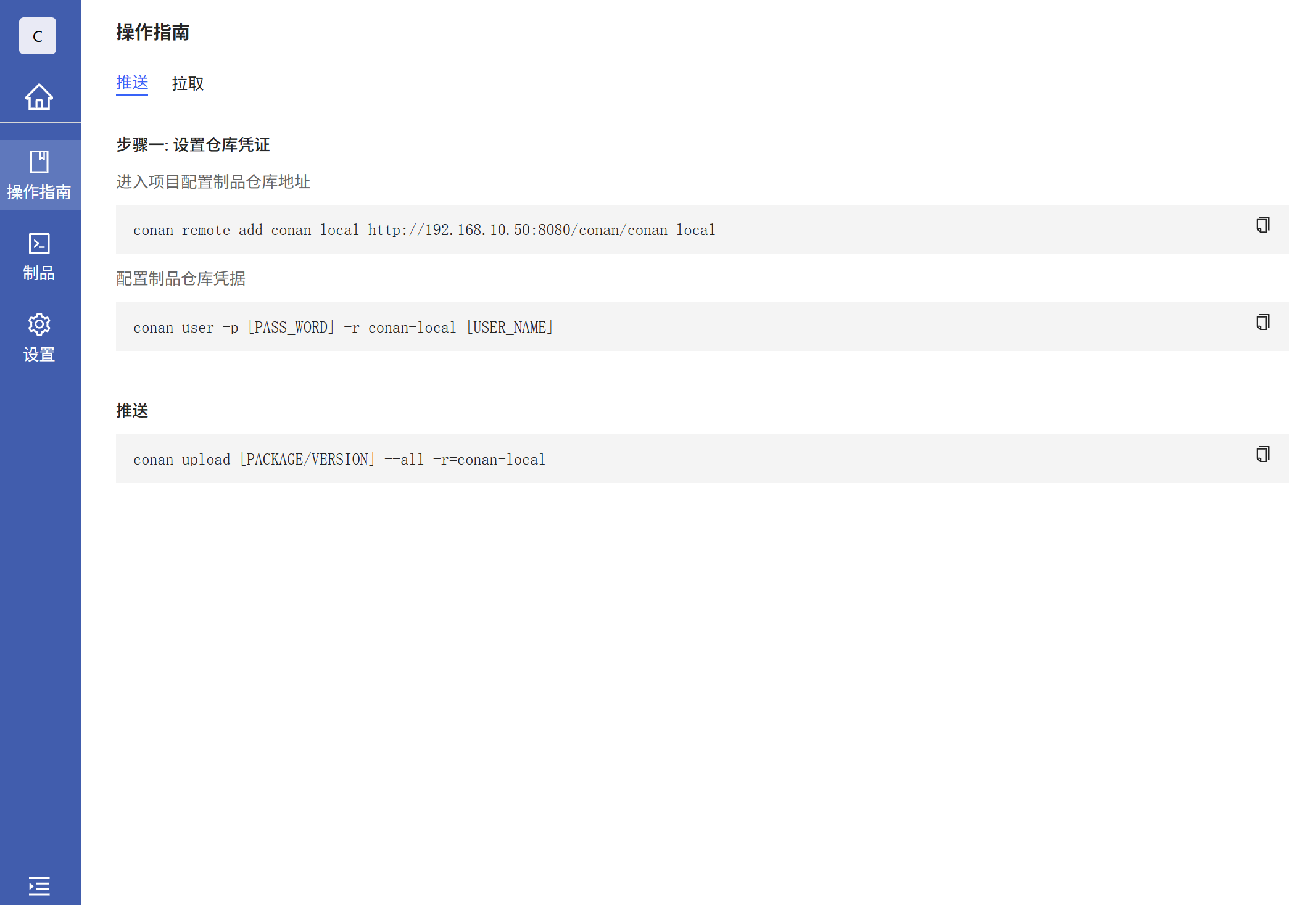 2,进入你刚刚创建的conan制品库,点击操作指南根据操作指南上面的步骤即可。