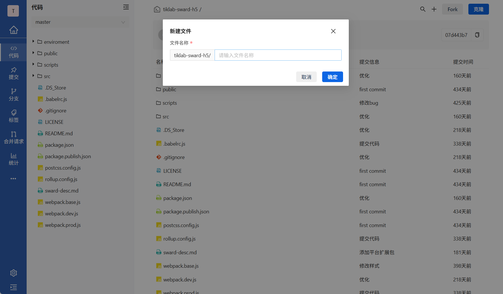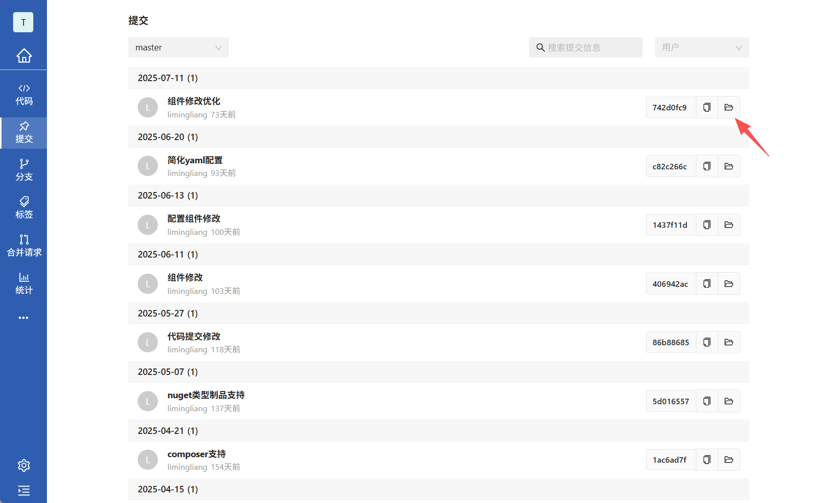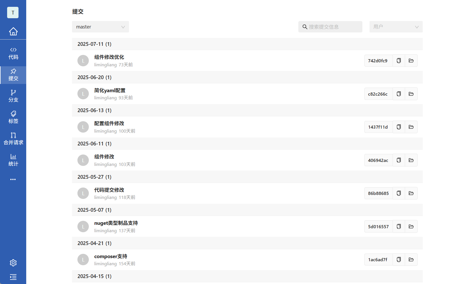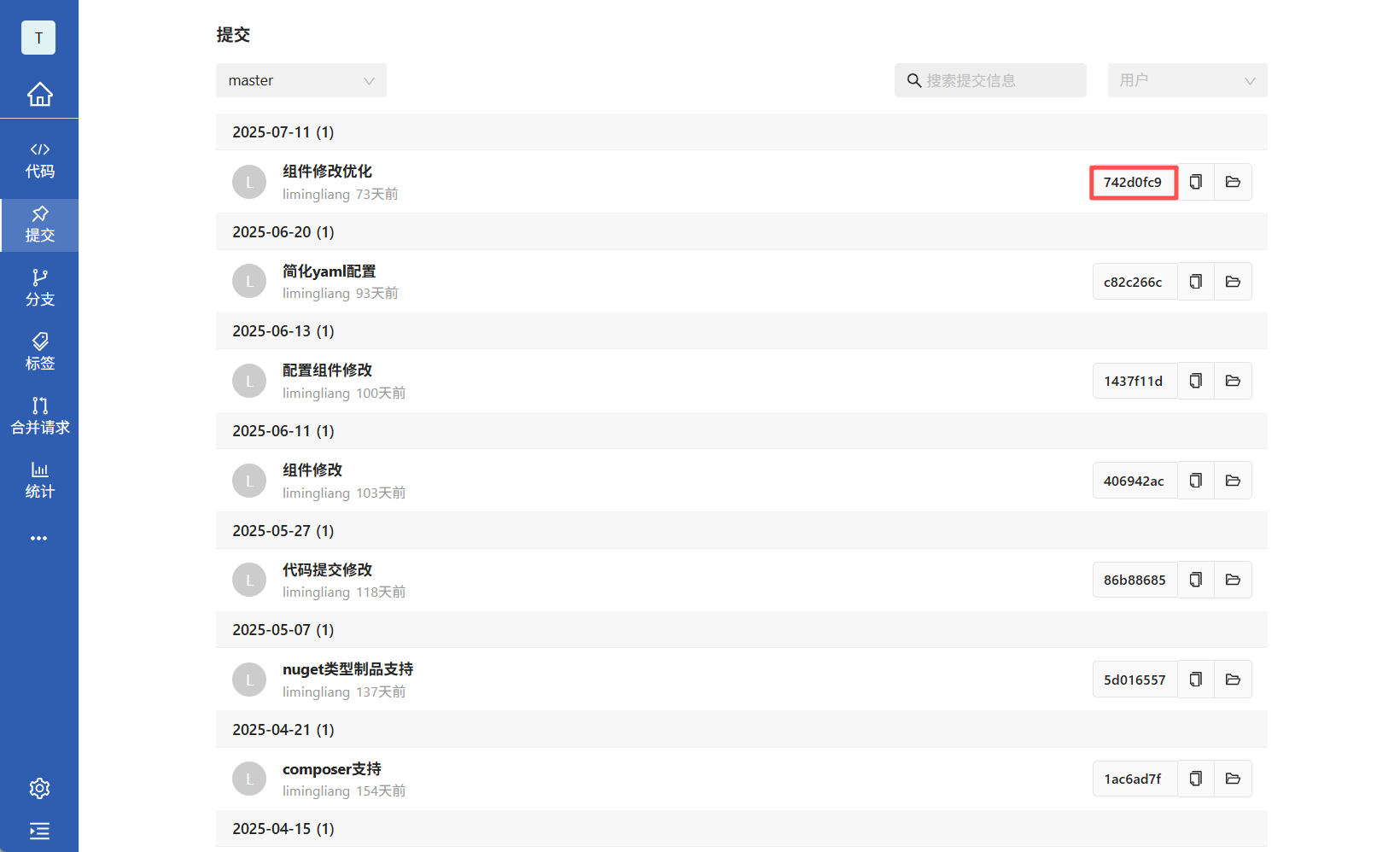查询提交:点击仓库名字后点击提交tab,可以根据切换分支、切换用户、提交信息模糊查询。