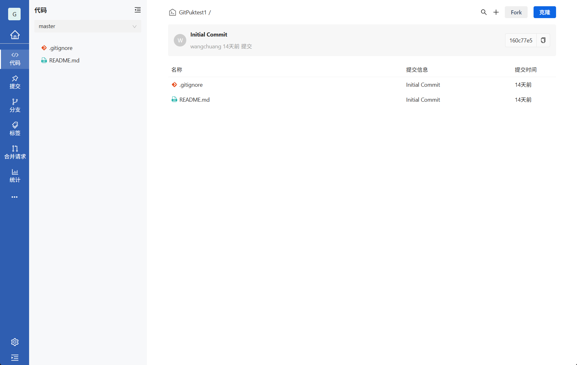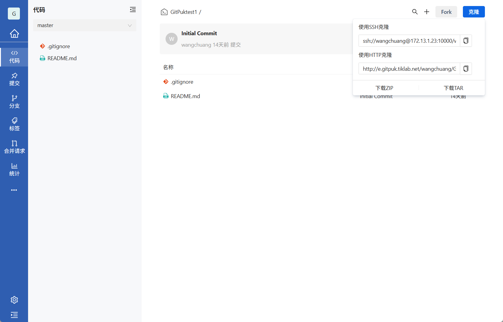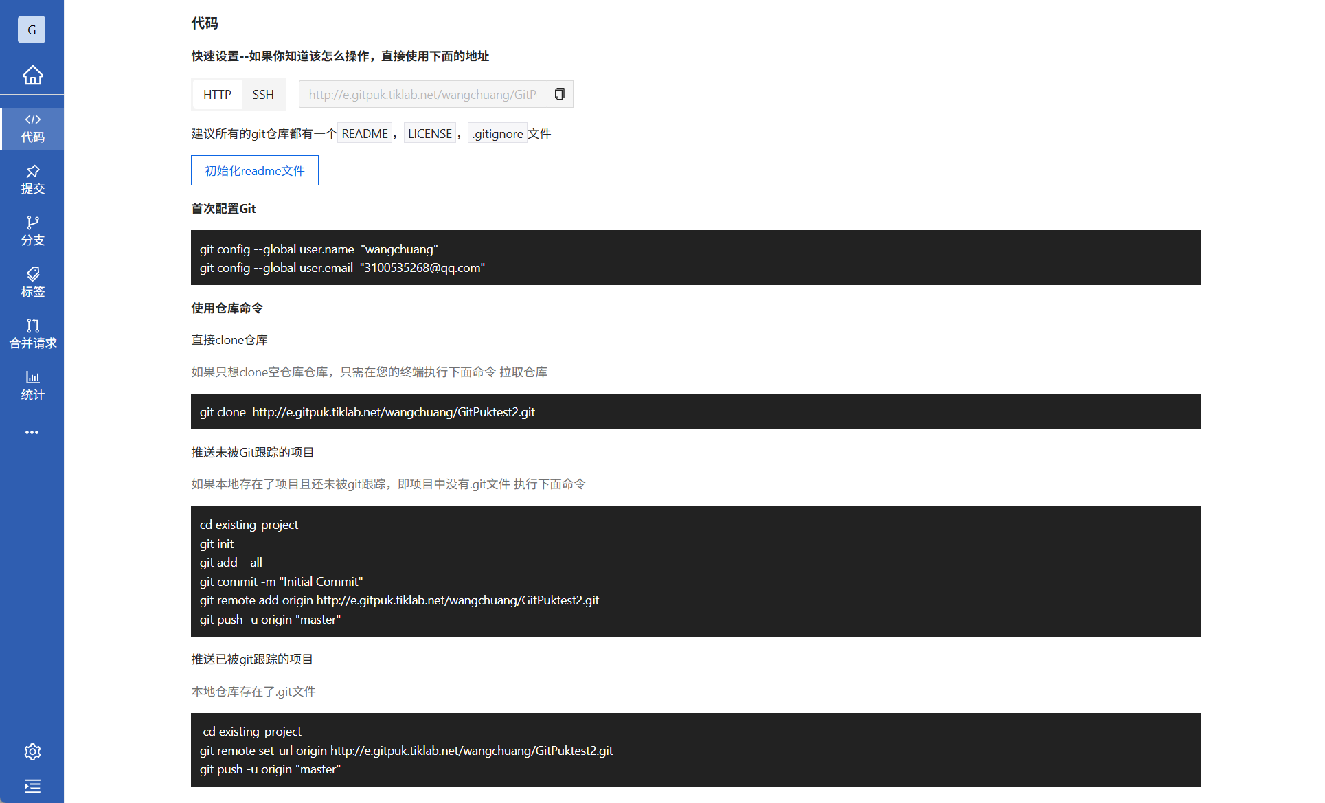 如:git clone http://e.gitpuk.tiklab.net/wangchuang/GitPuktest1.git