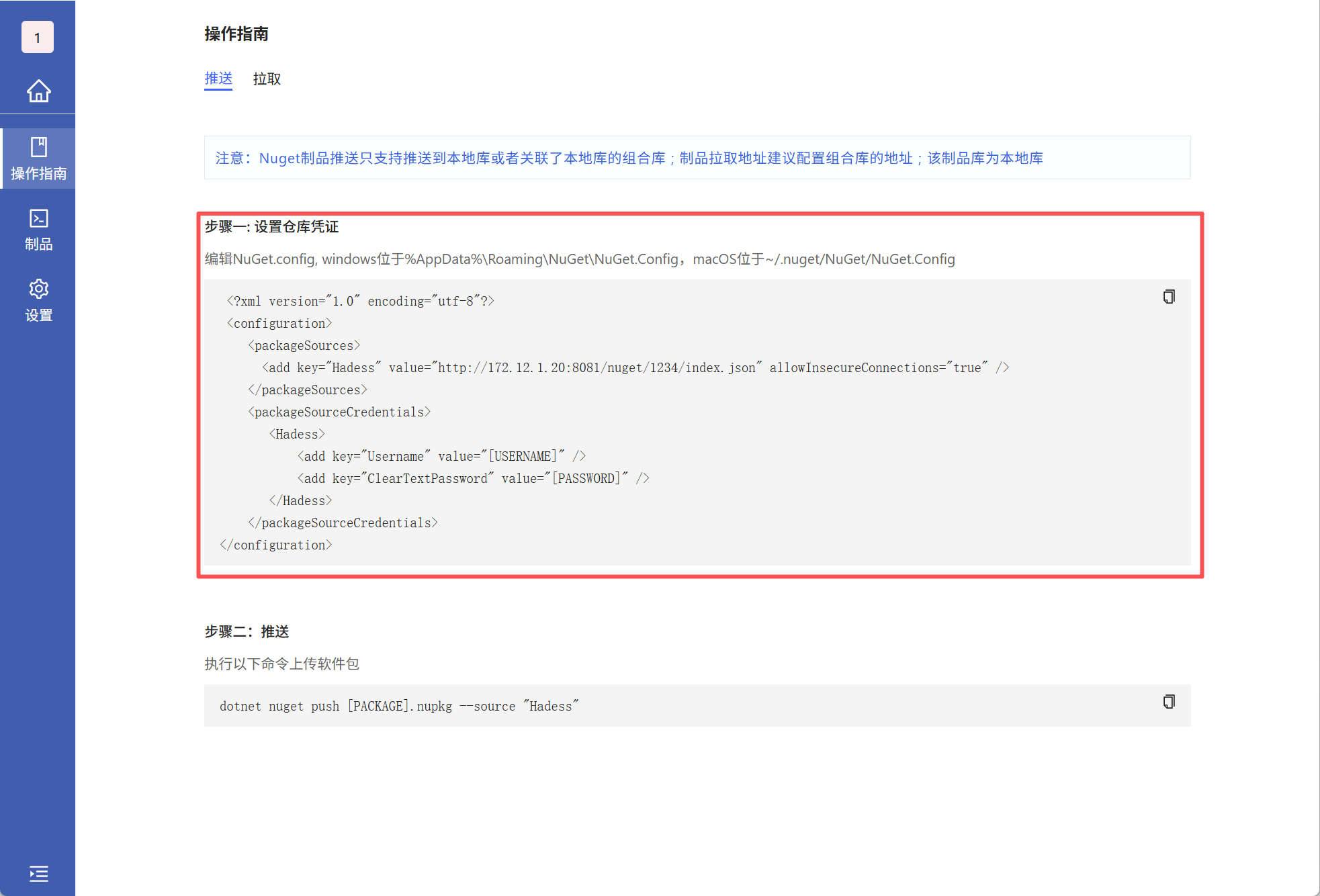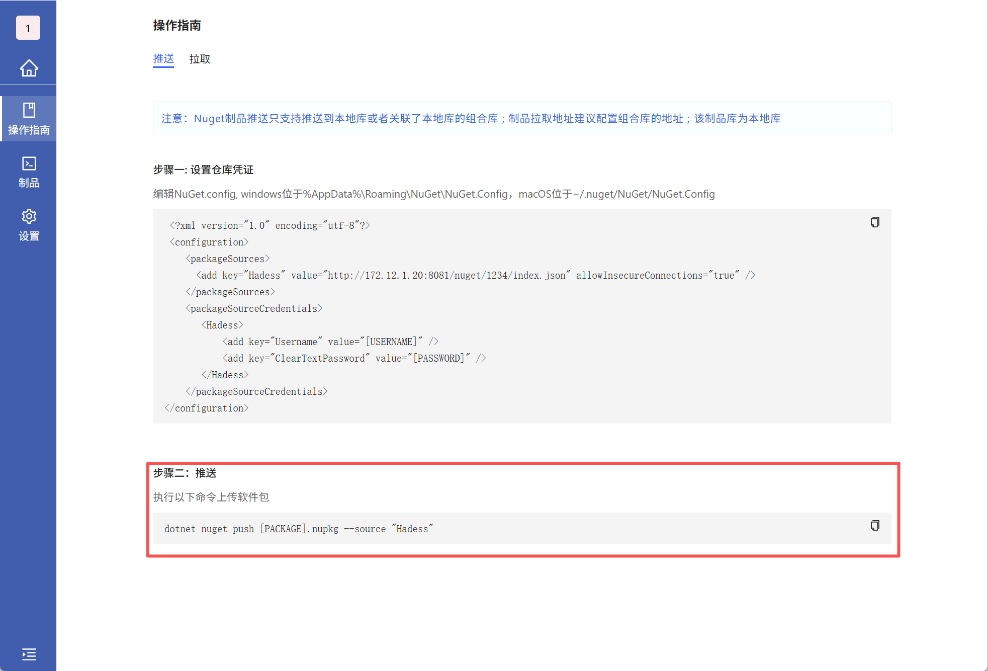 - 推送:进入制品库界面点击左上角操作指南选择Nuget进入操作指引界面,替换对应的文本执行命令即可。