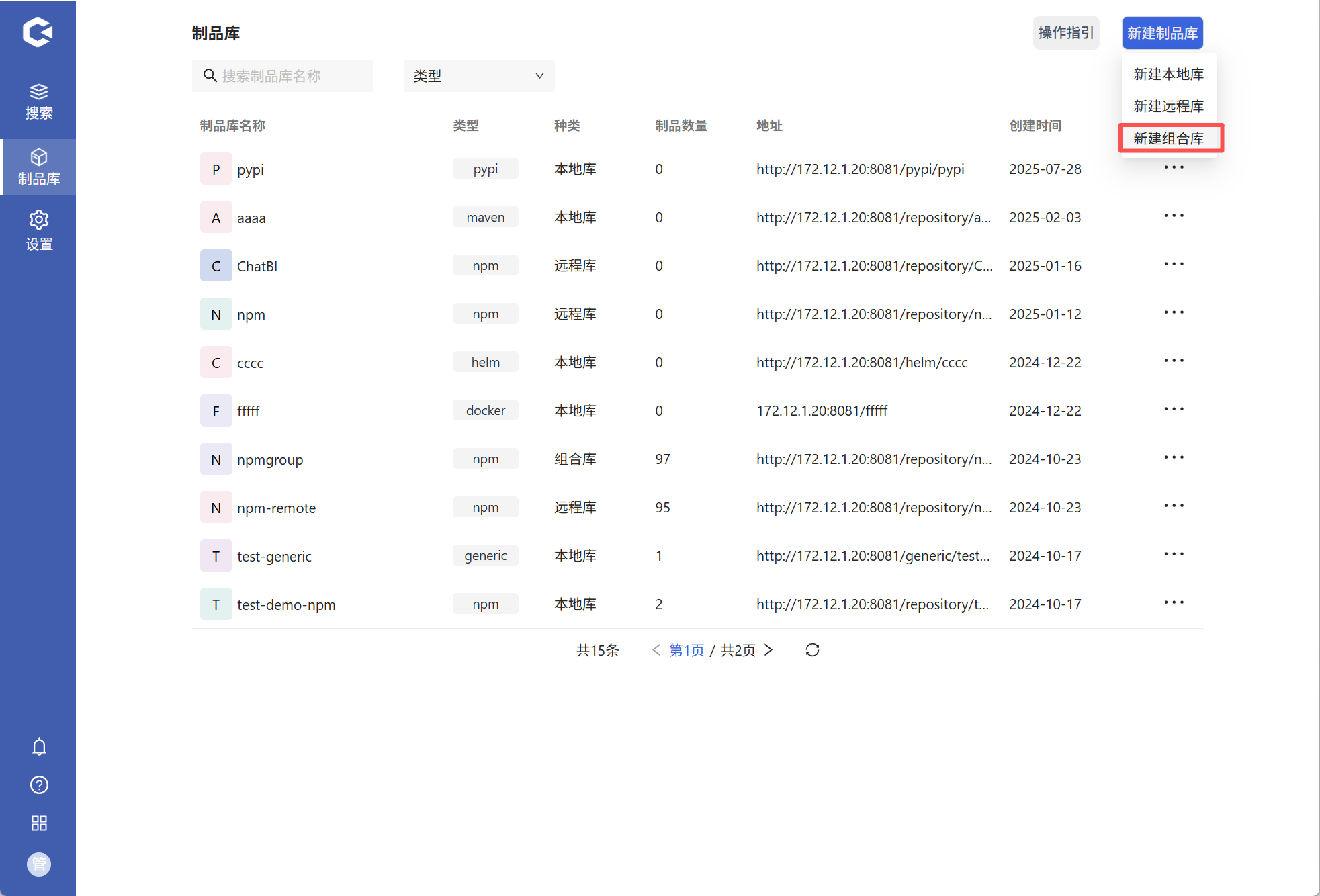 - 打开创建远程库界面:点击新建制品库选择新建组合库输入信息点击确认即可